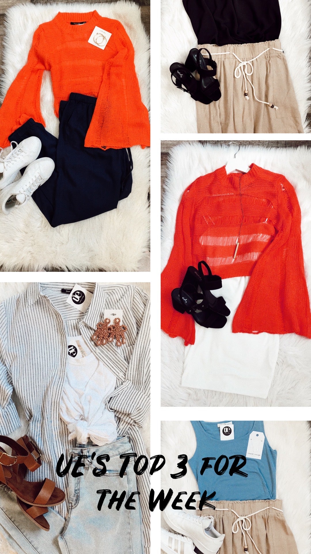 This week's new arrivals here at UE scream summer vibes all around; varying from lake day basics to outfits with a pop of color for a fun night out!Β We are so excited to be releasing this week's, "Weekend Getaway" collection.Β We are loving how each piece has the ability to be dressed up or down, makingΒ the most versatile of clothing. This week we wanted to share with you guys our three favorites of the new arrivals, as well as some of our ideas on how to style them uniquely. #1: Wynn Top This flare sleeve sweater with a pop of orange...