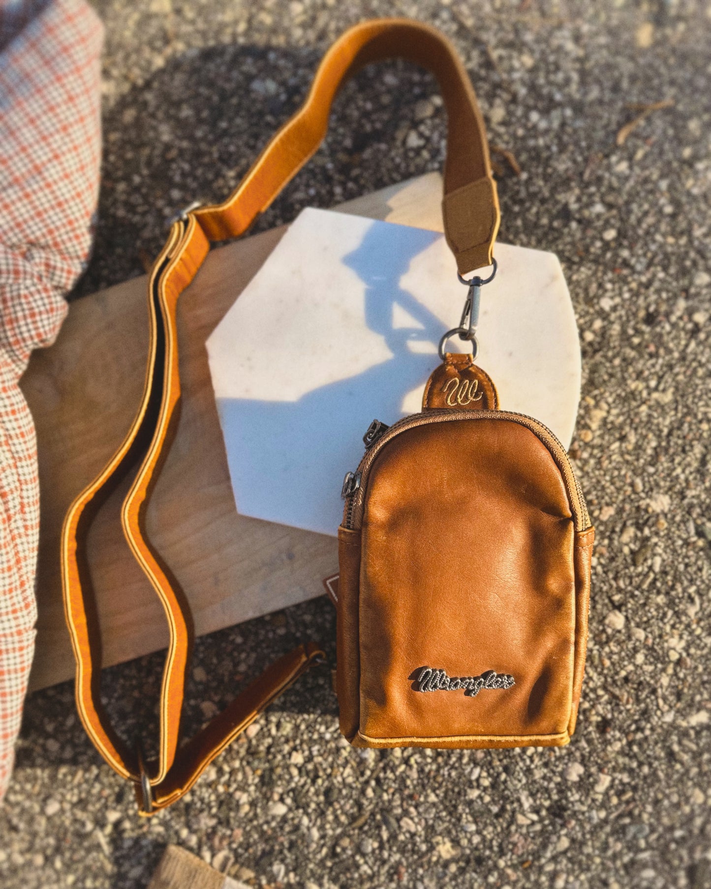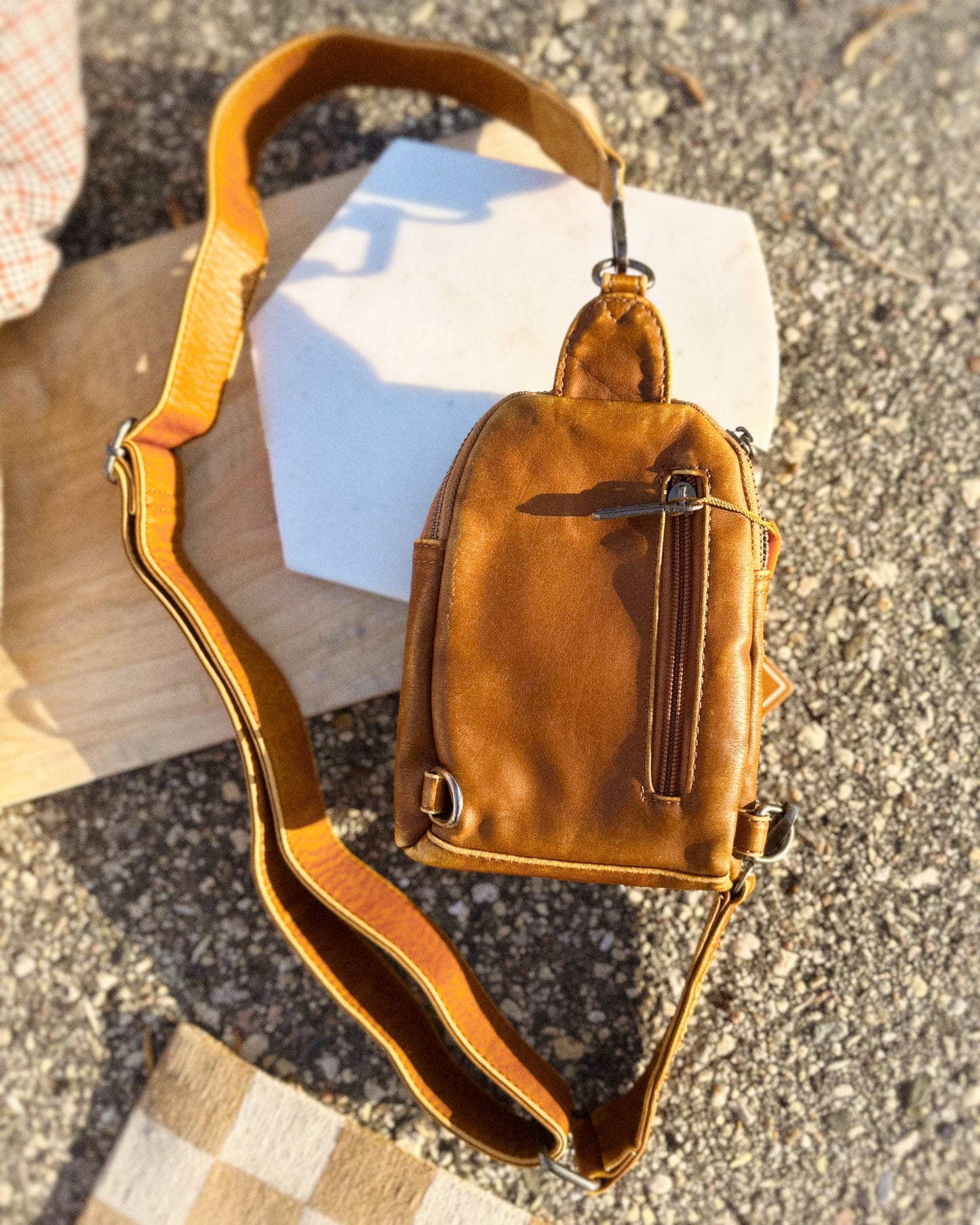 2 outside zippered pockets. 1 has slots for cc’s and the other has 1 smaller slot/pocket in it. + outside pocket on the bag. Adjustable strap