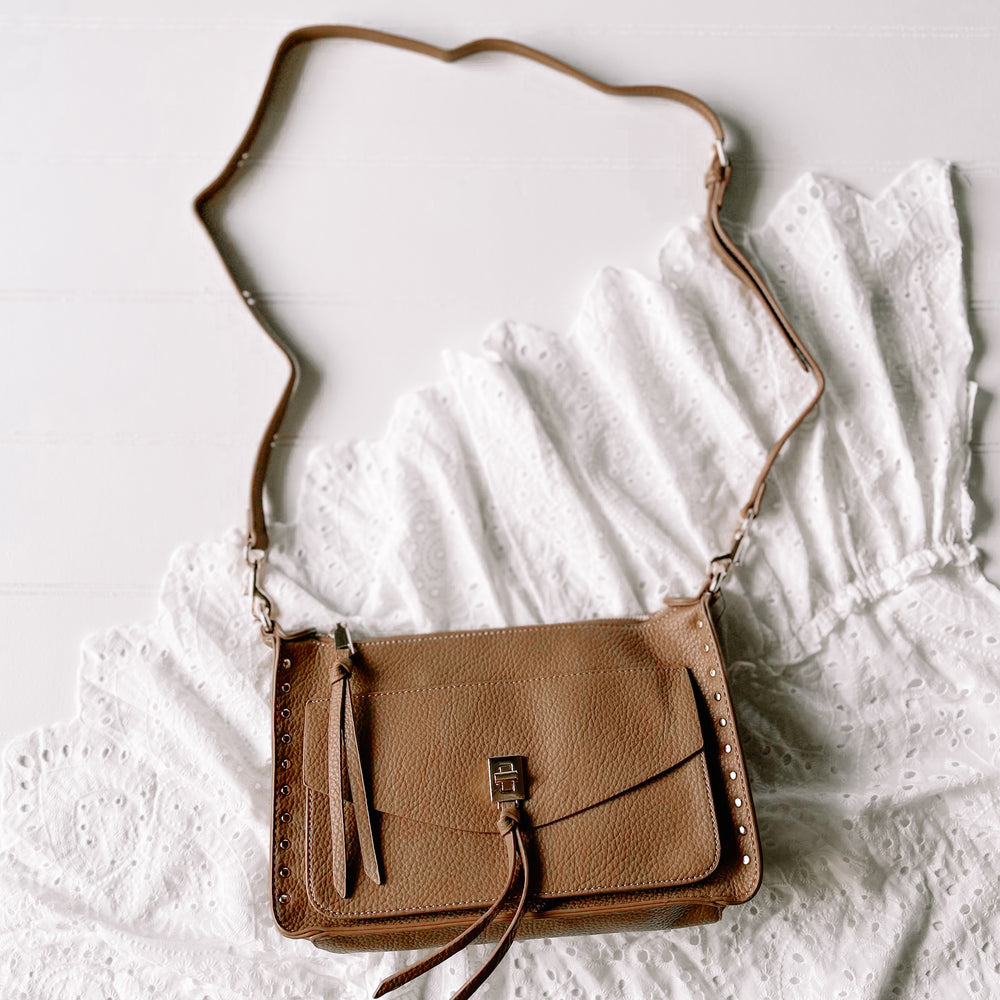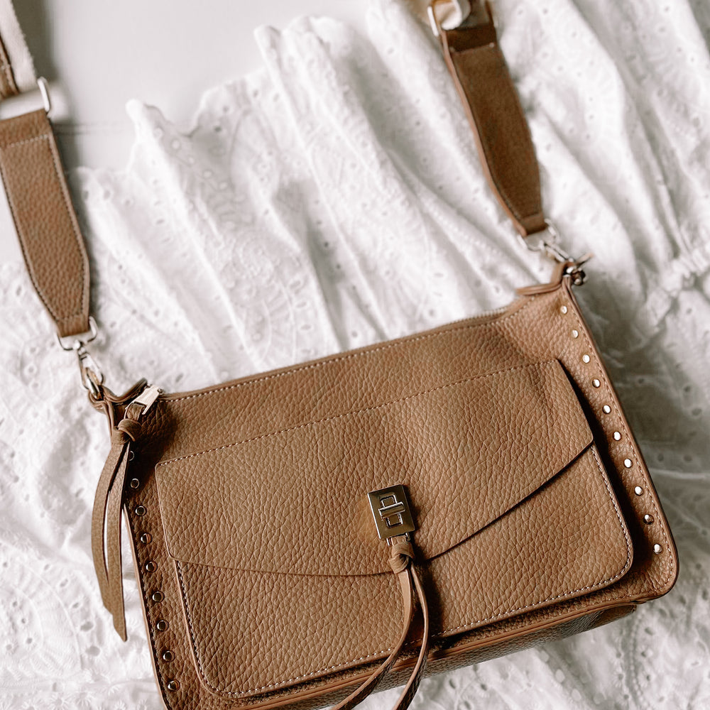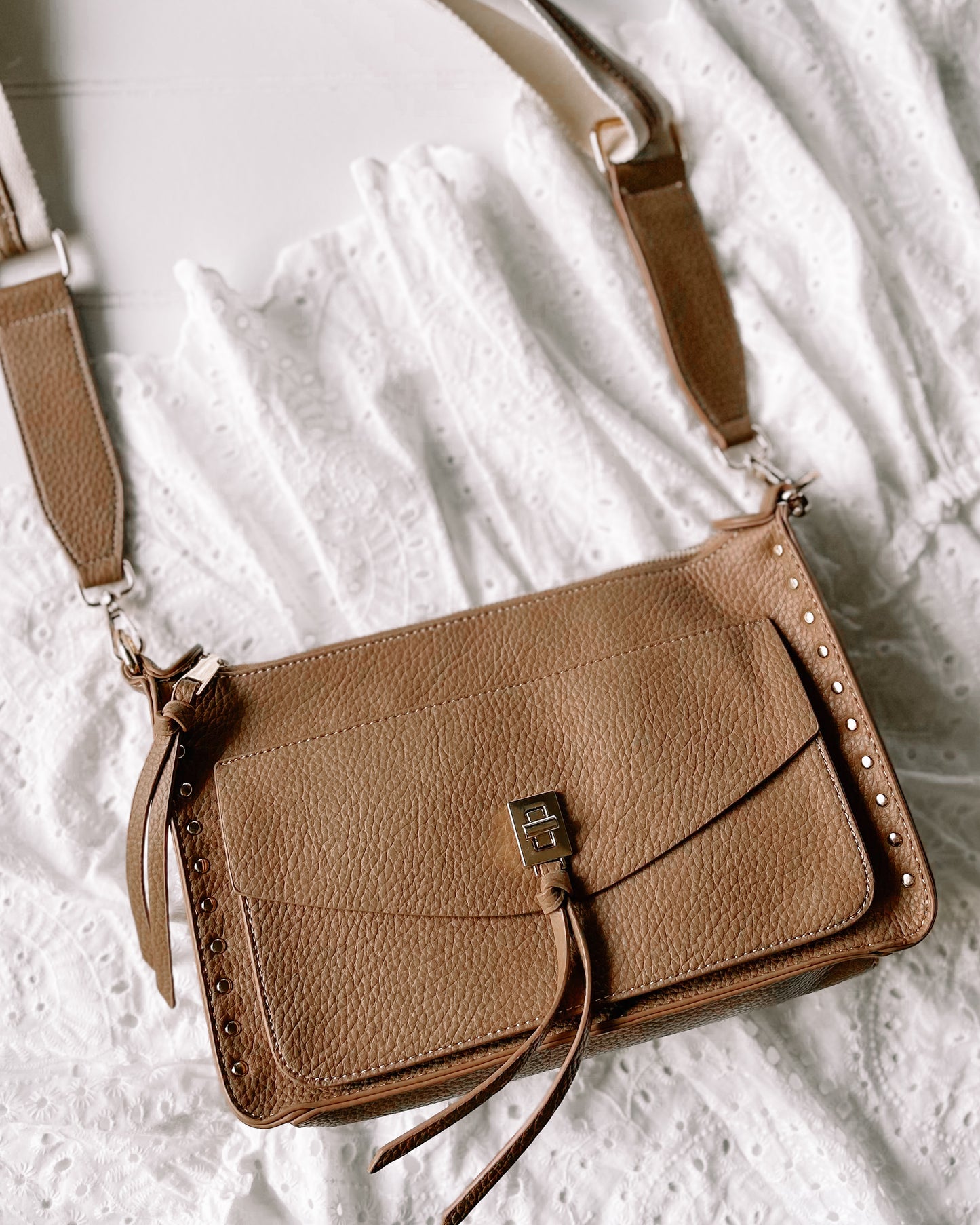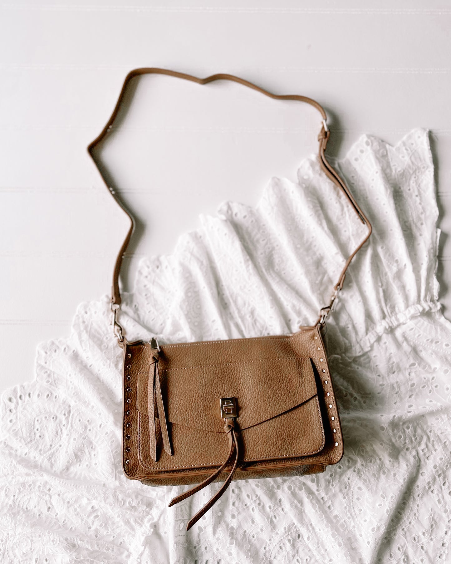 zipper top. small side zipper pocket inside along with 2 open side pockets.
