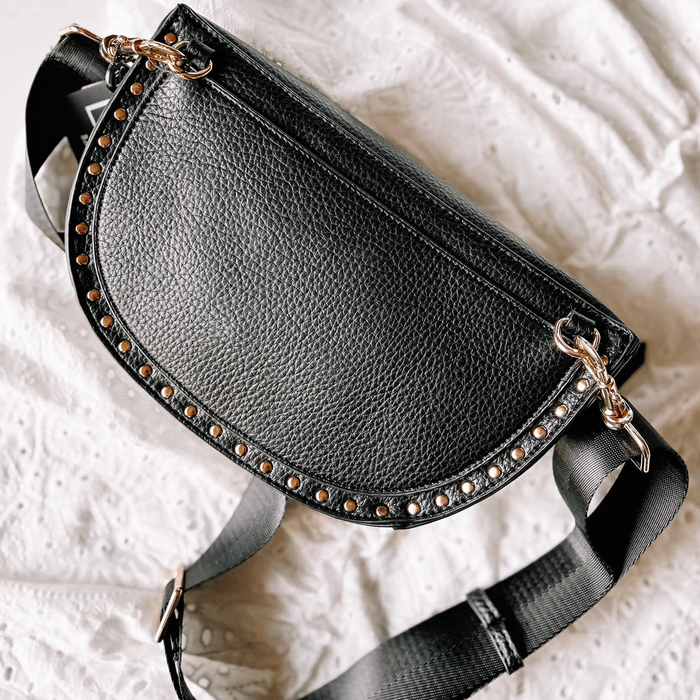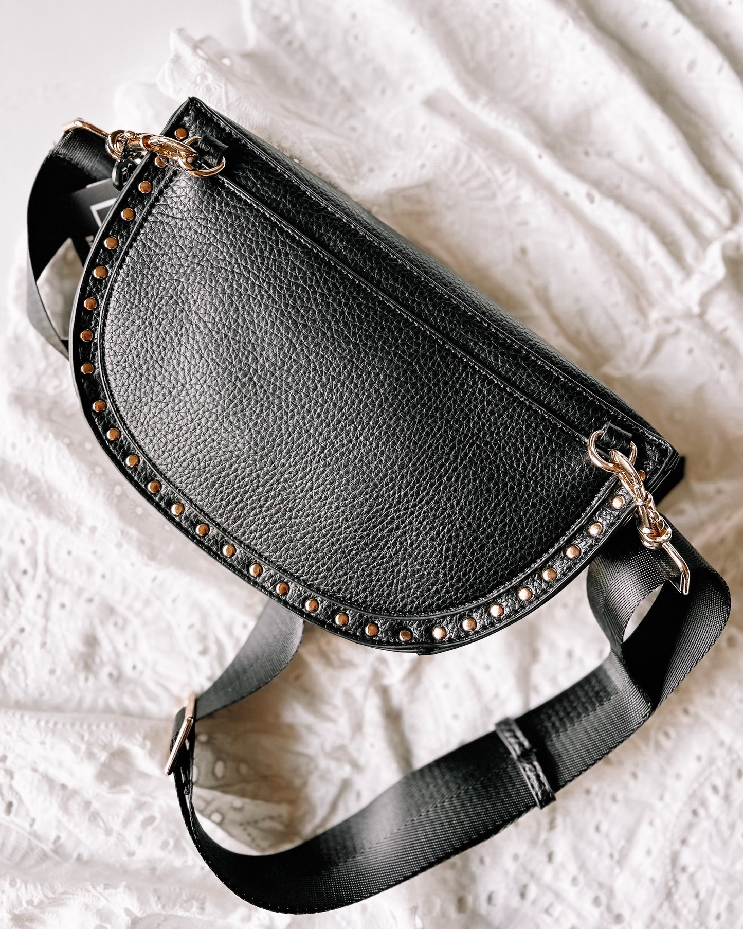open pocket on the back of purse, zippered opening on the front with zipper pocket inside. adjustable strap... wear as a fanny pack style or cross body