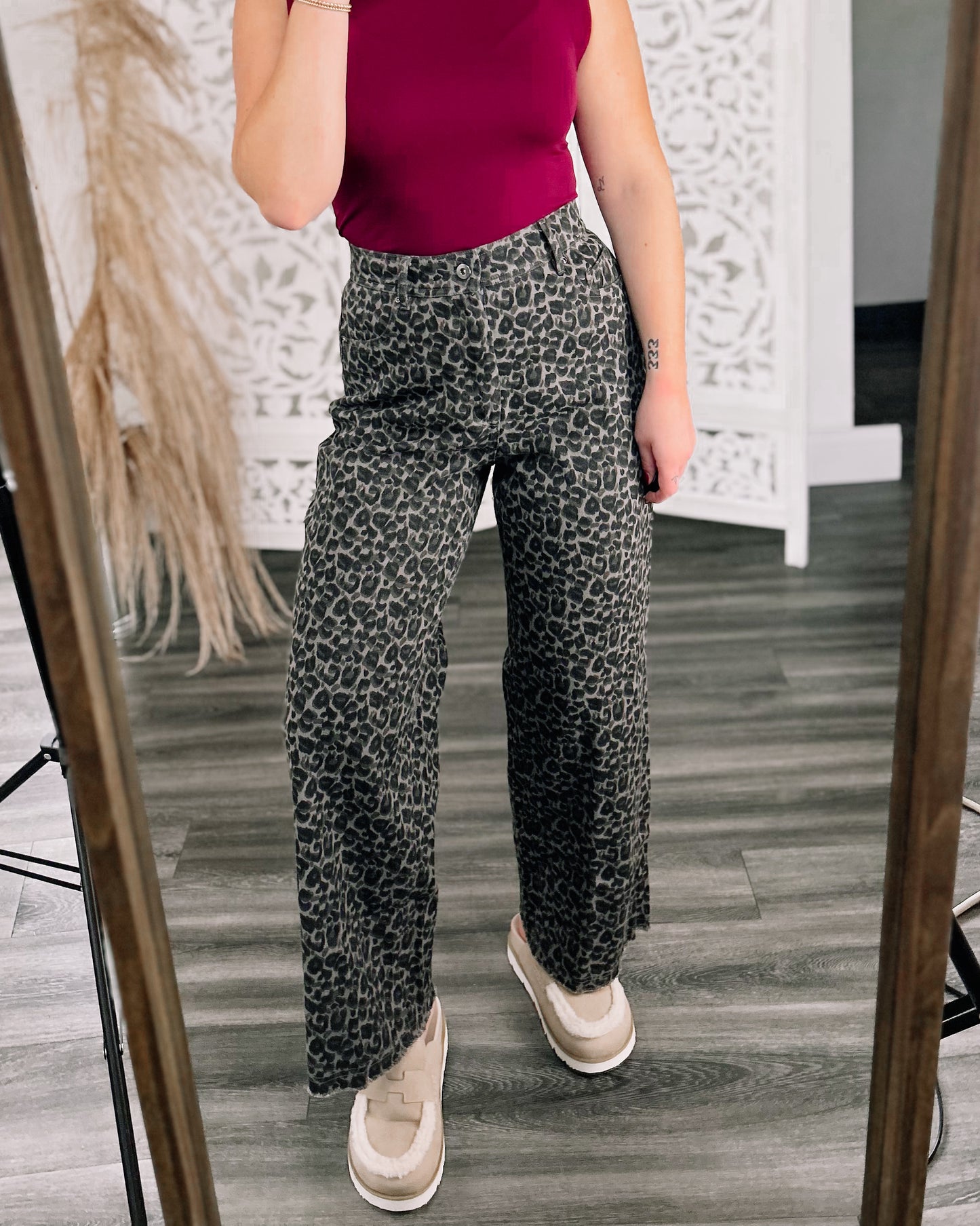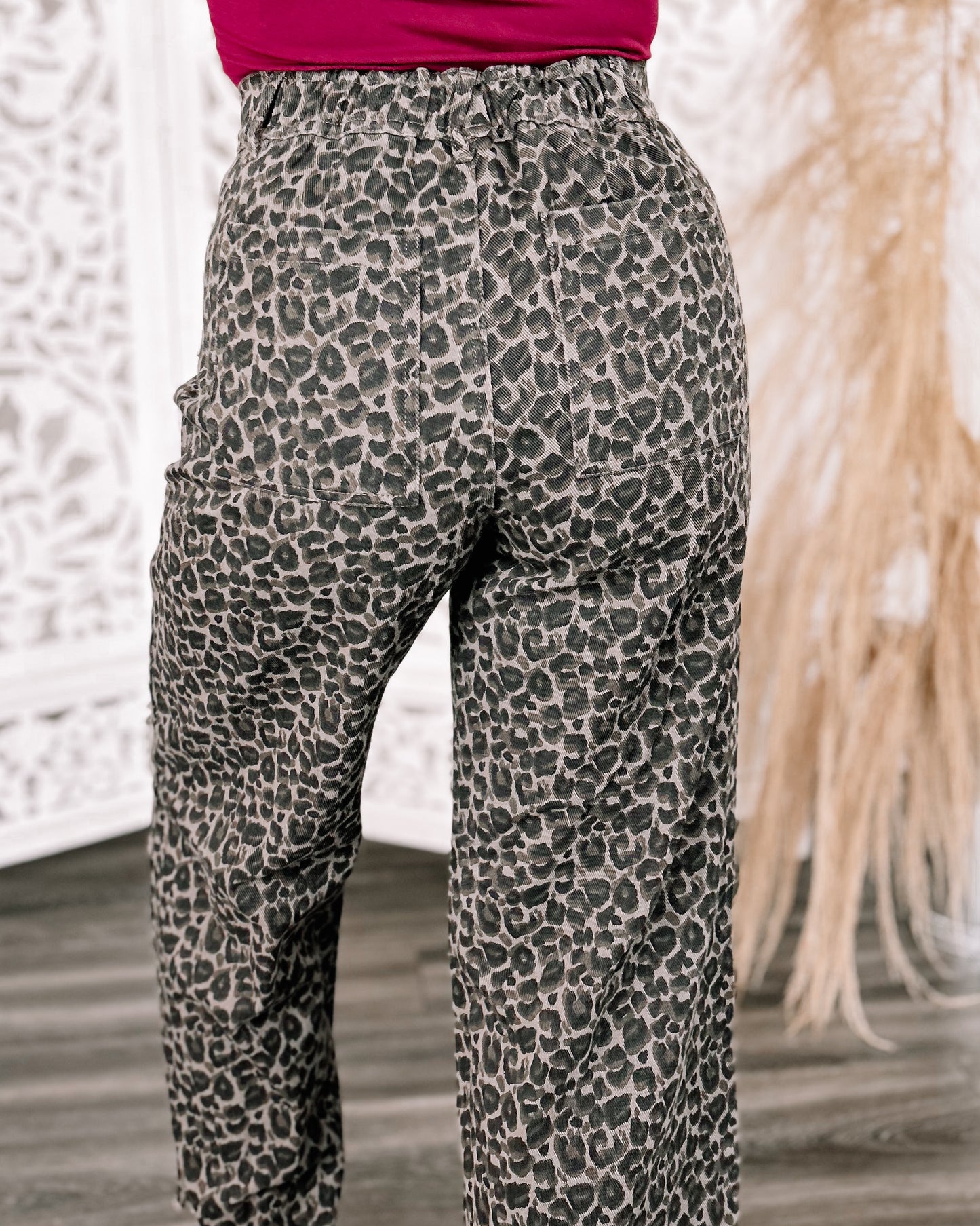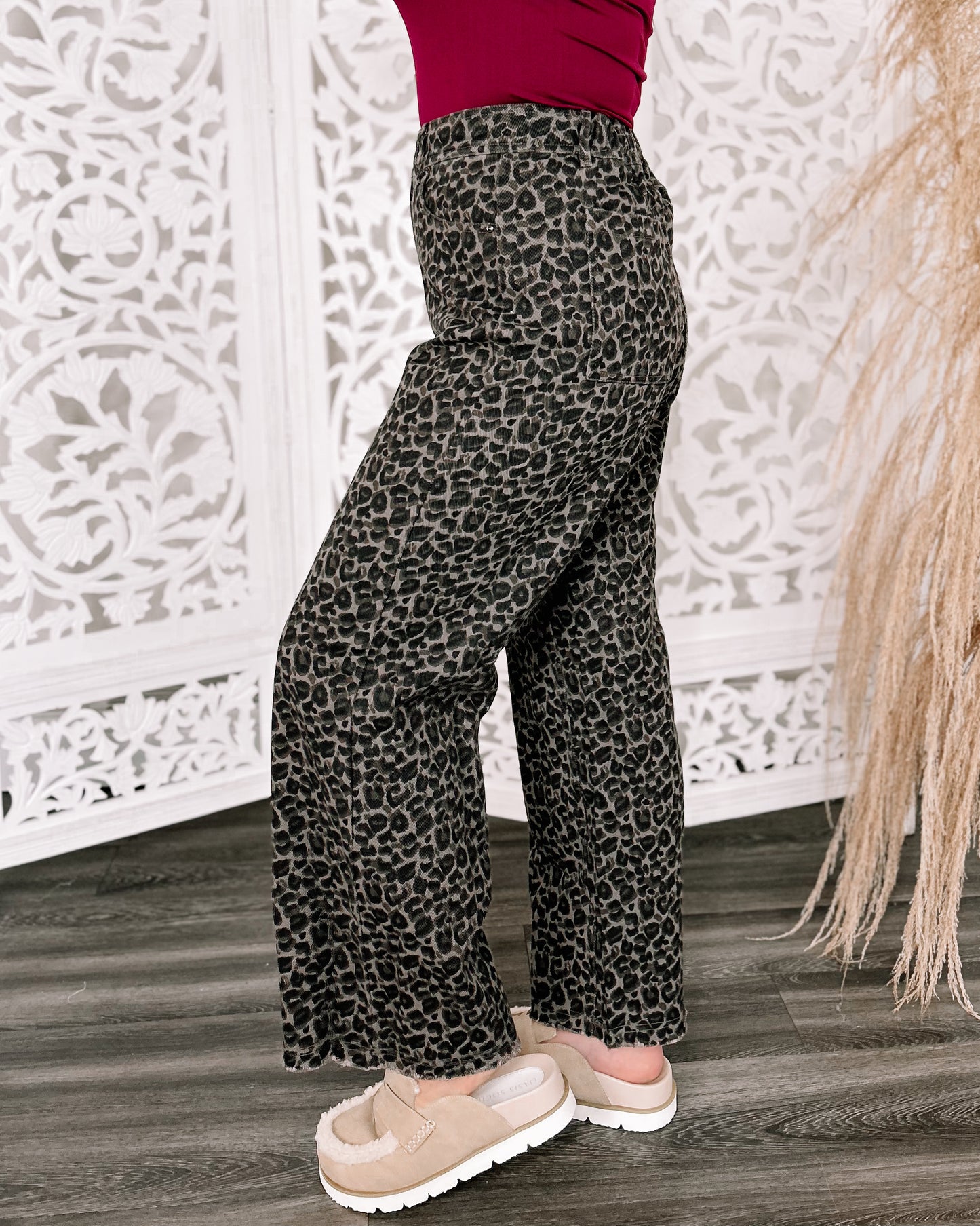 DETAILS: Fall in love with leopard in the "Catch Me Later" straight leg denim pants in dark leopard, boasting a frayed hem, handy belt loops, and roomy side and back pockets.