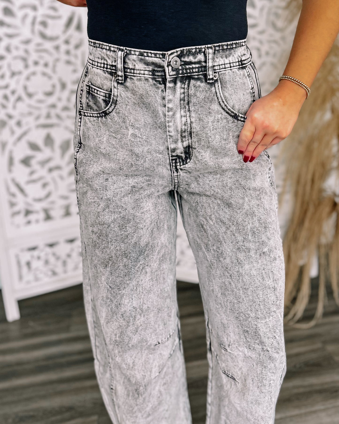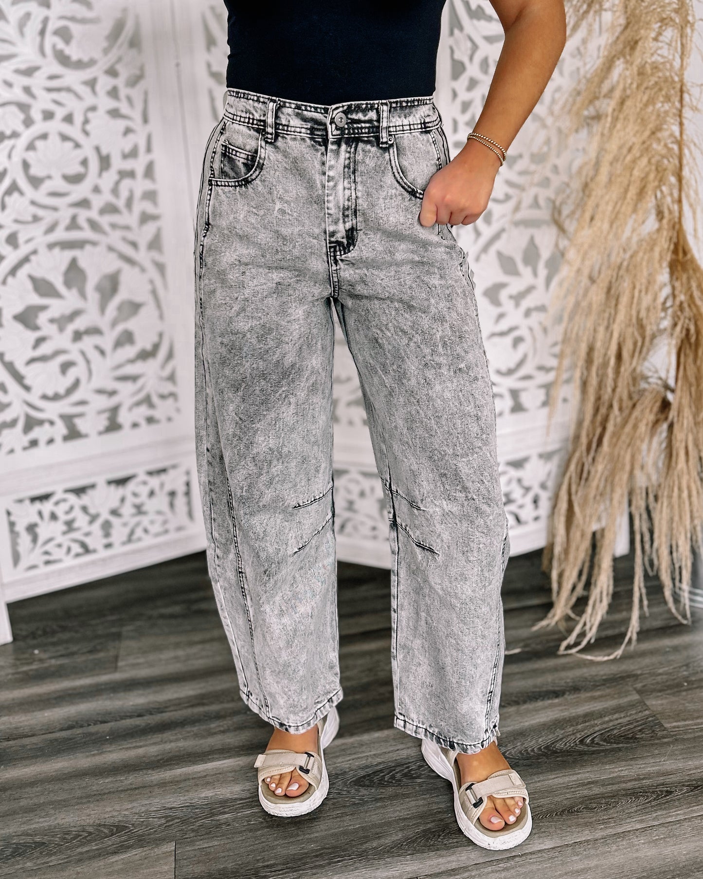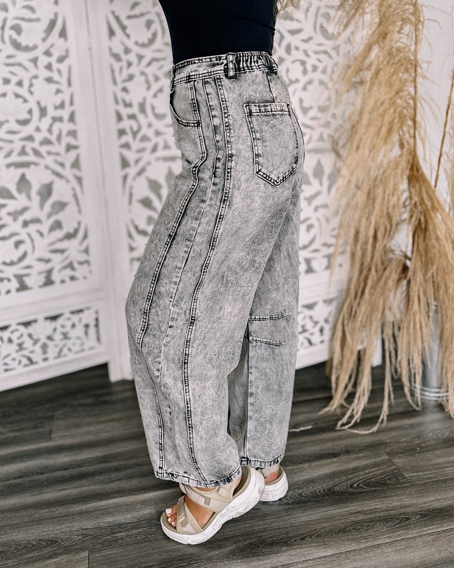 DETAILS: These grey Asher Jeans feature a roomy wide-leg barrel cut, comfy elastic waistband, handy pockets, and a cool washed finish for that effortlessly stylish vibe.