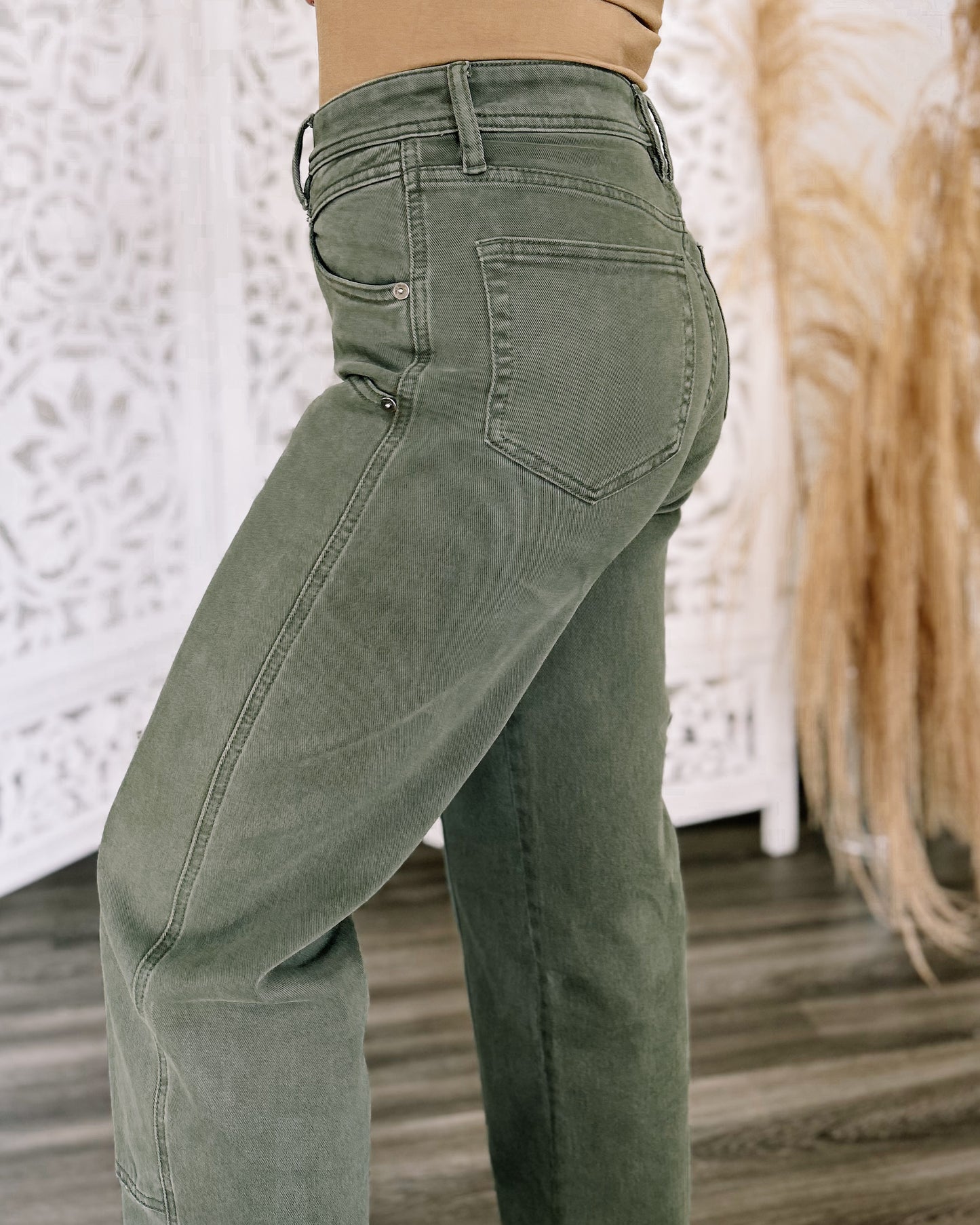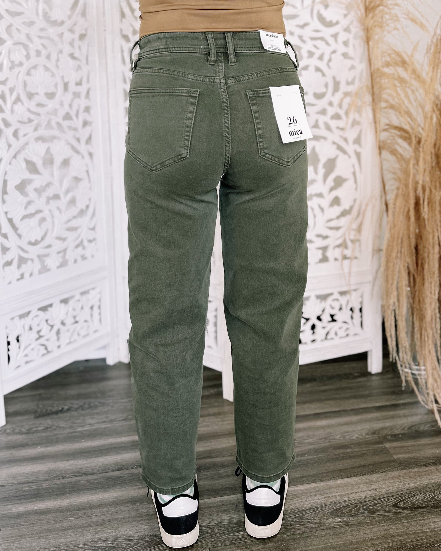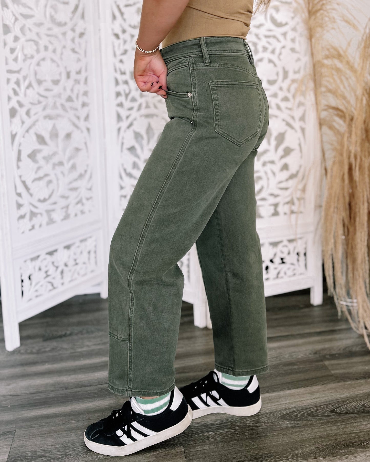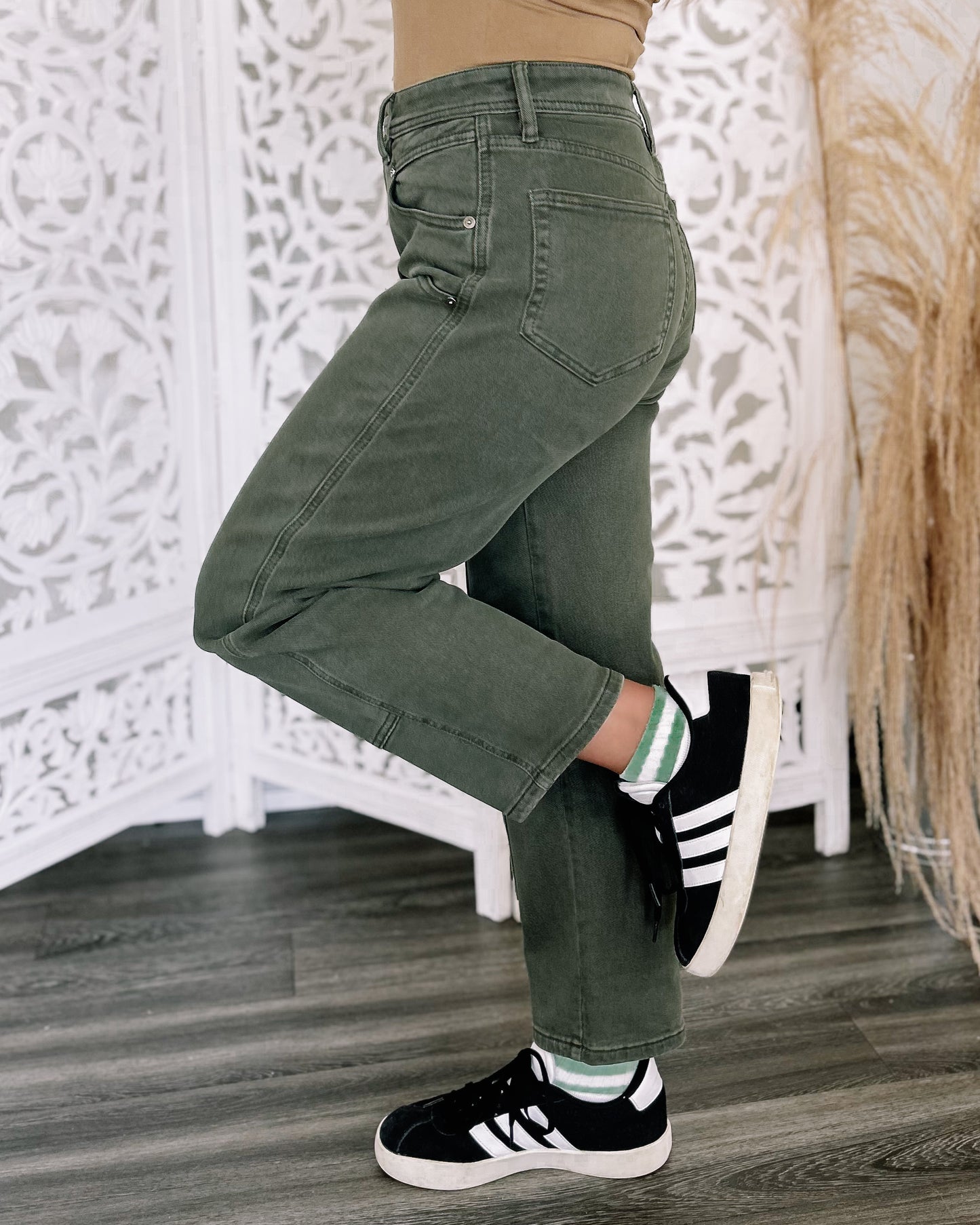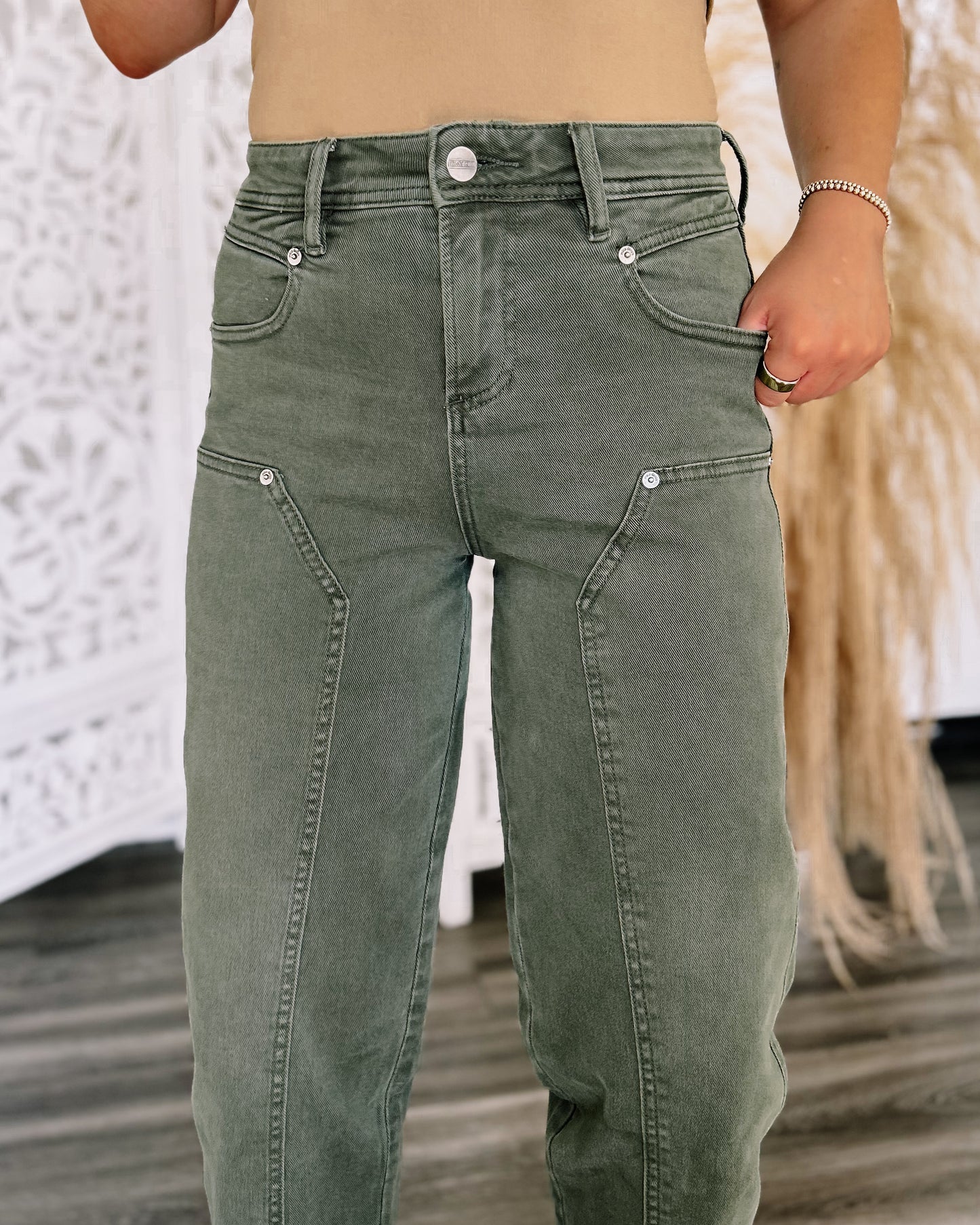 Green pants you can’t skip this fall! Featuring a high-rise fit and midi ankle length, these tapered straight-leg utility jeans bring playful style and practical vibes.