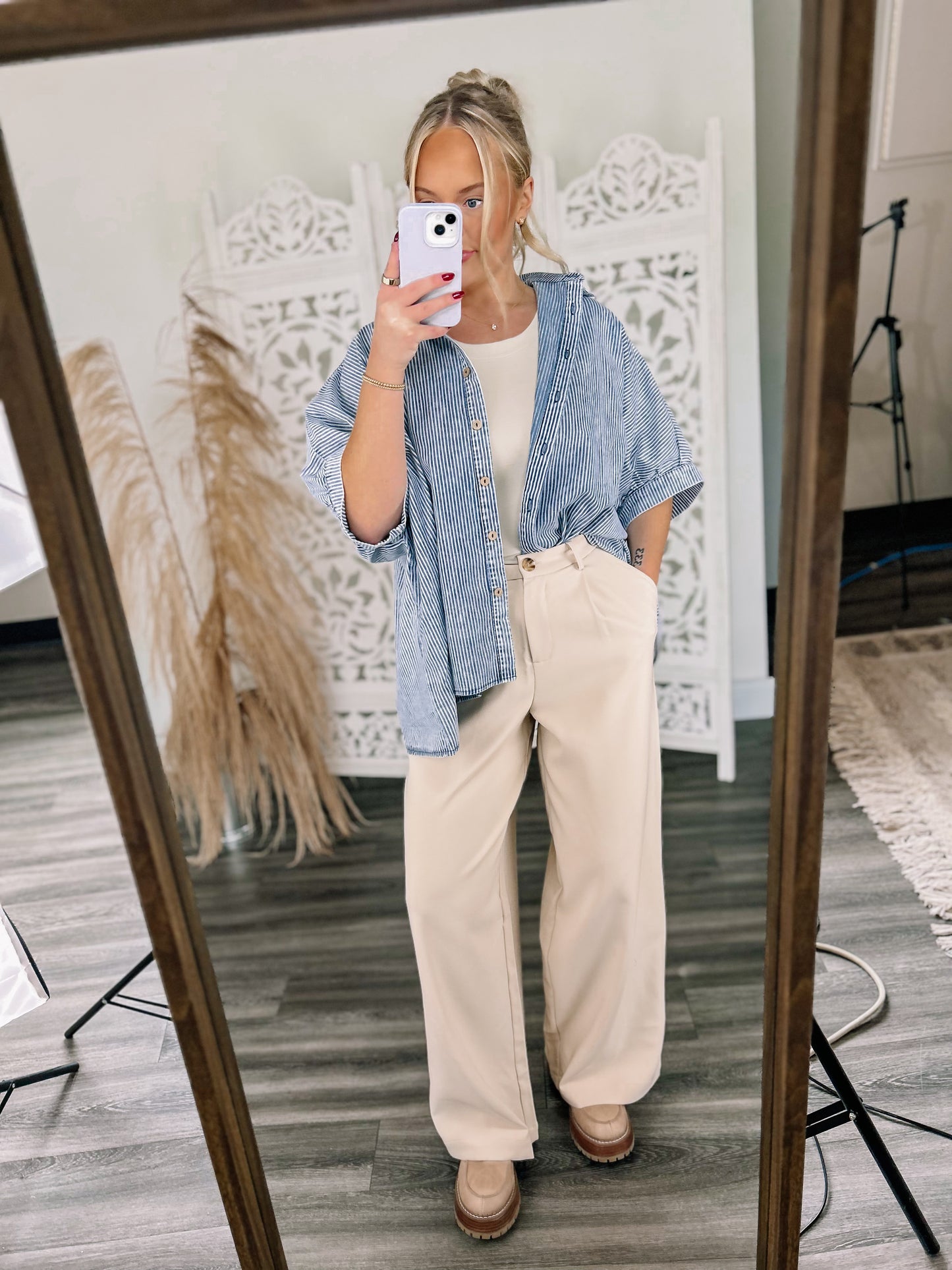 DETAILS: These taupe wide-leg trousers strike a fun balance between sleek tailoring and all-day comfort.