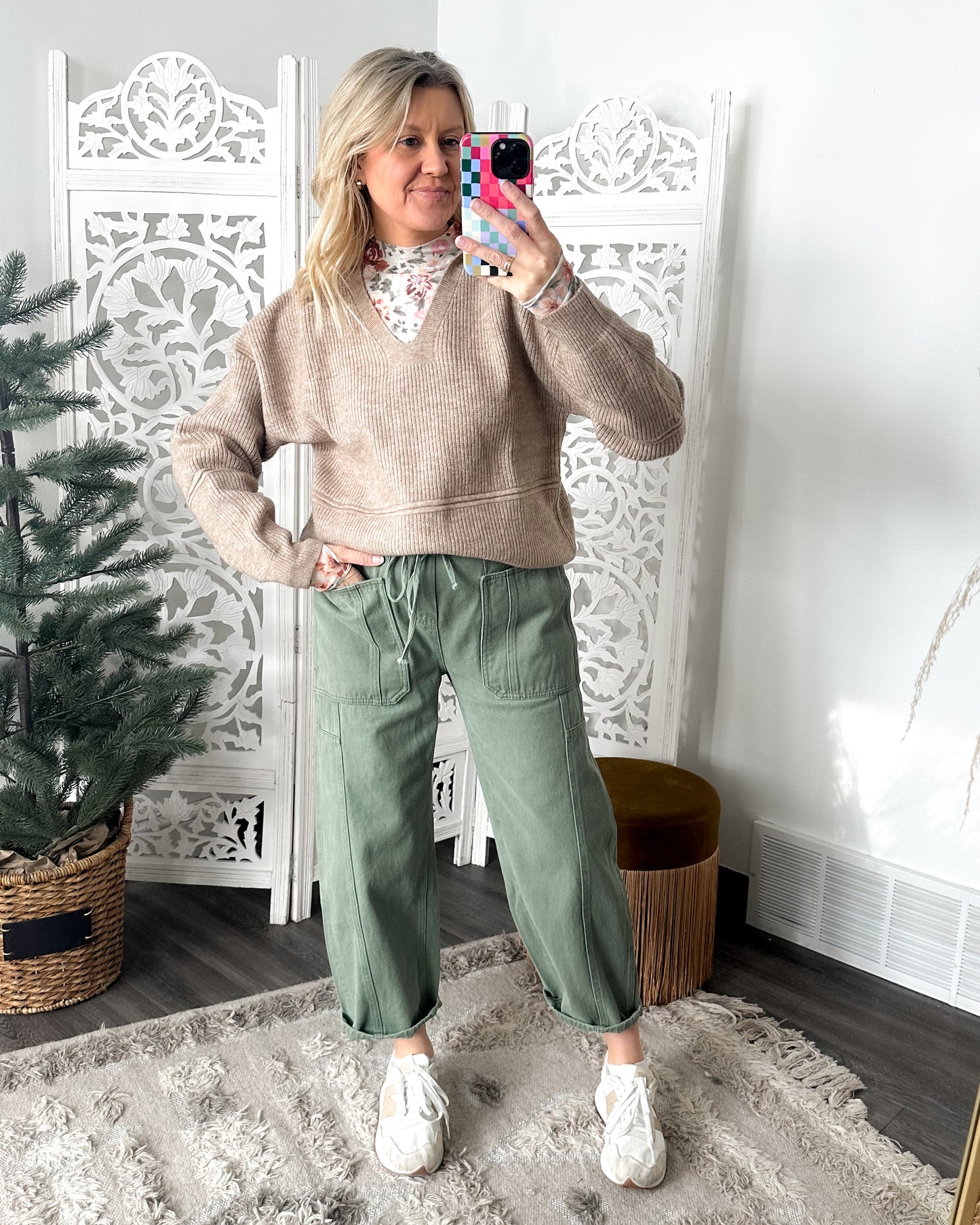 FIT: Eryn is wearing a size small. Fitted top with good length, if in between sizing go down a size.