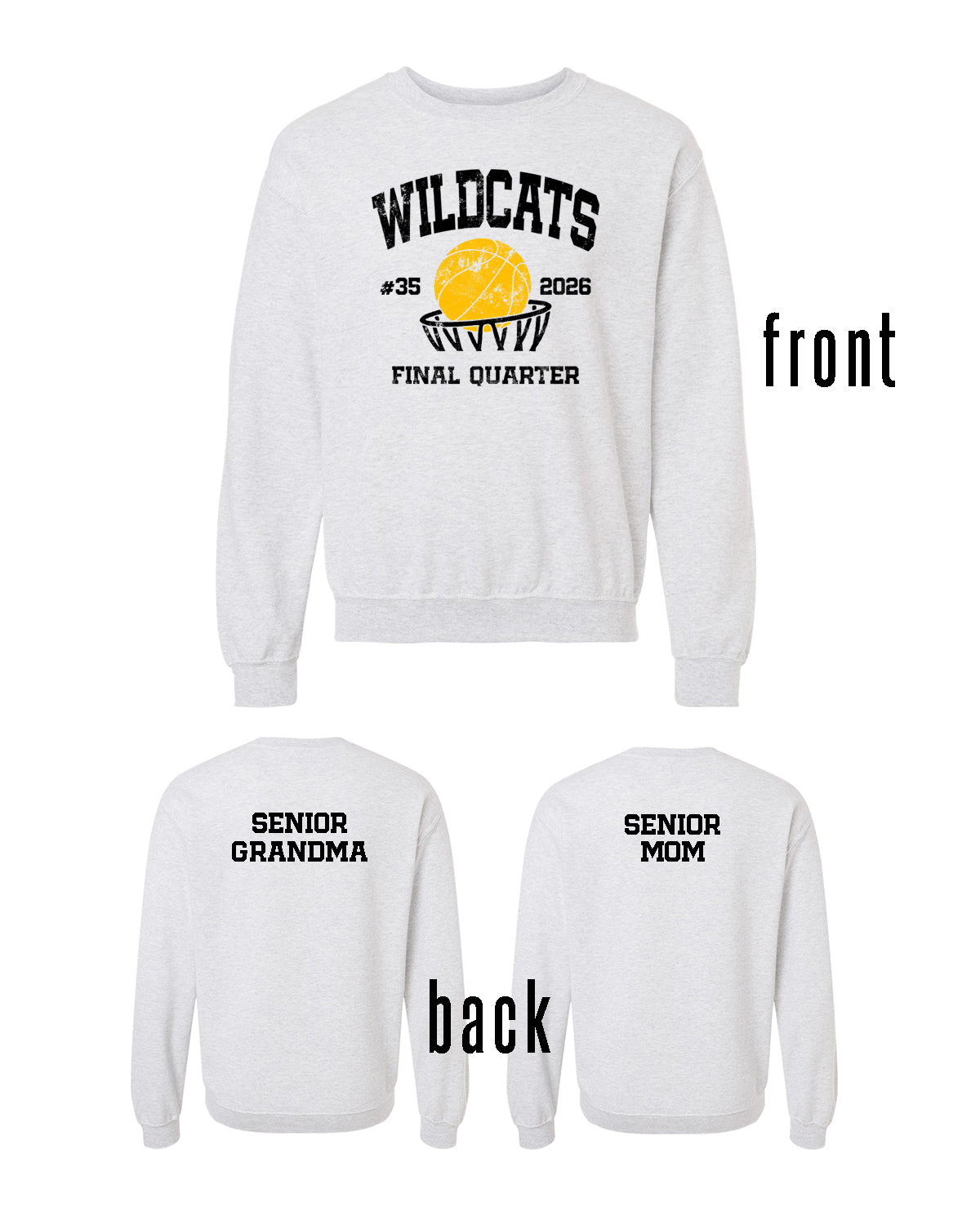 2) what you want printed on the back. some examples are: SENIOR MOM, SENIOR DAD, SENIOR GRANDMA, etc