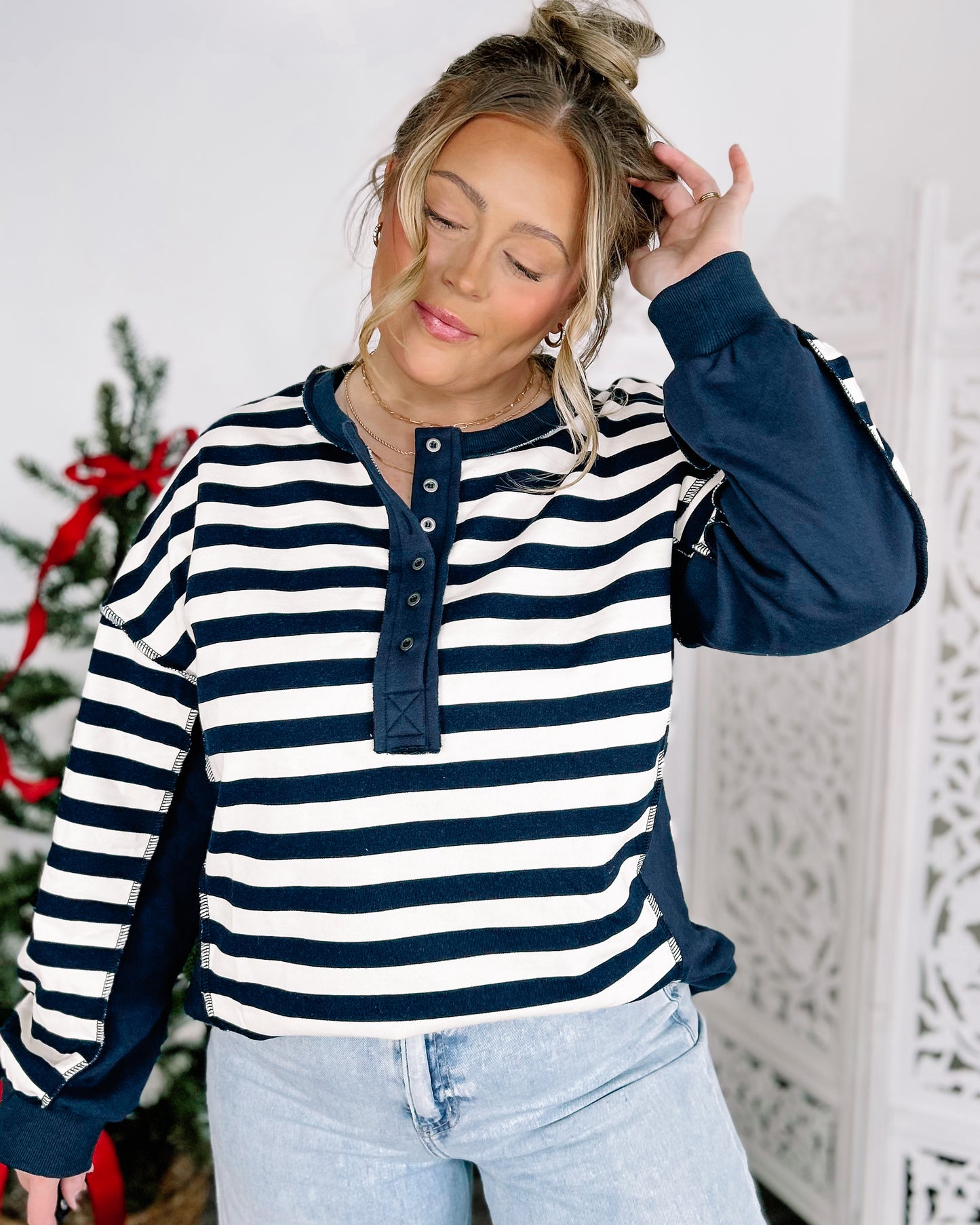 Regular price $24.50DETAILS: Relaxed Striped Half-Button Knit Pullover in Taupe Throw on this laid-back knit top and embrace effortless style.