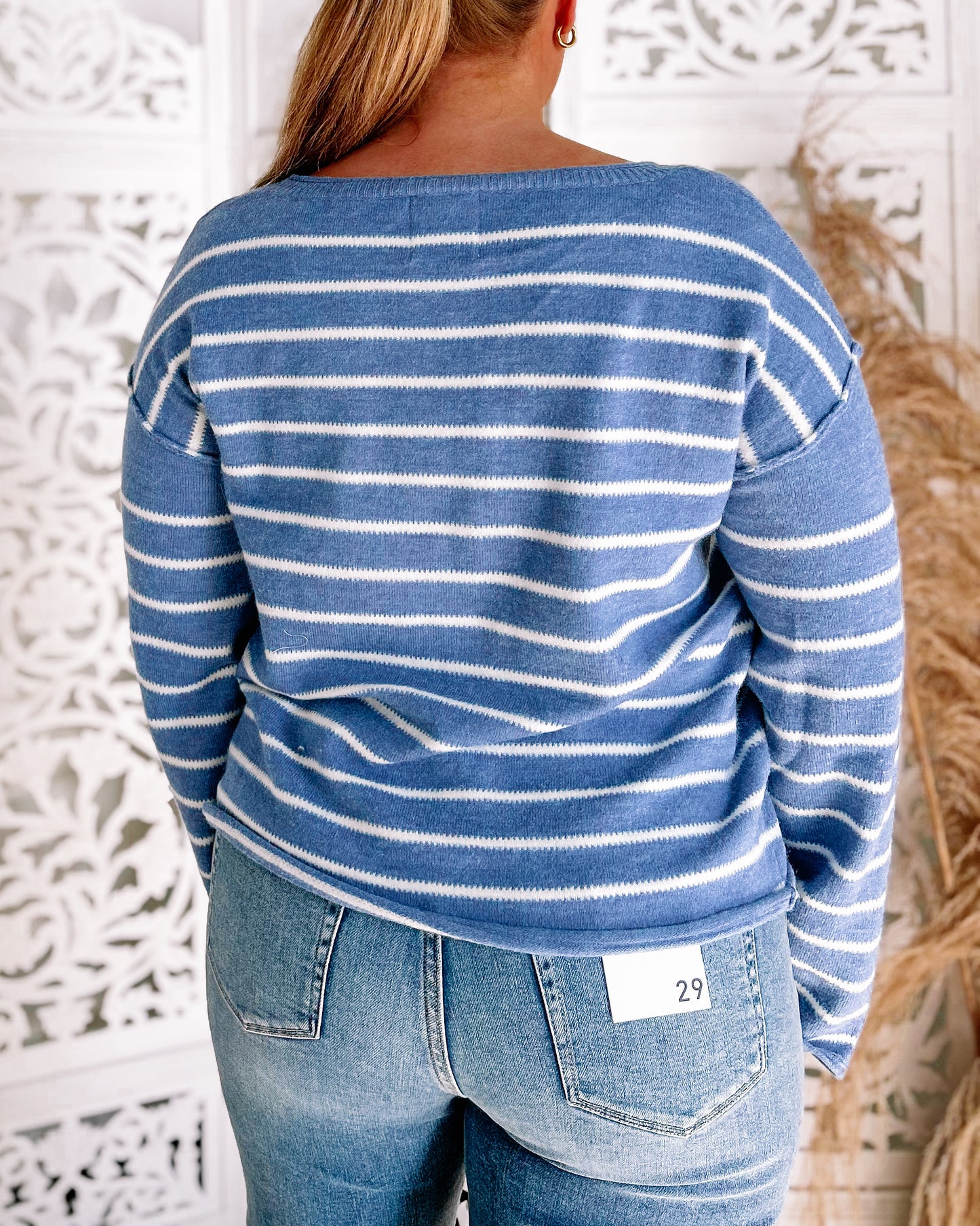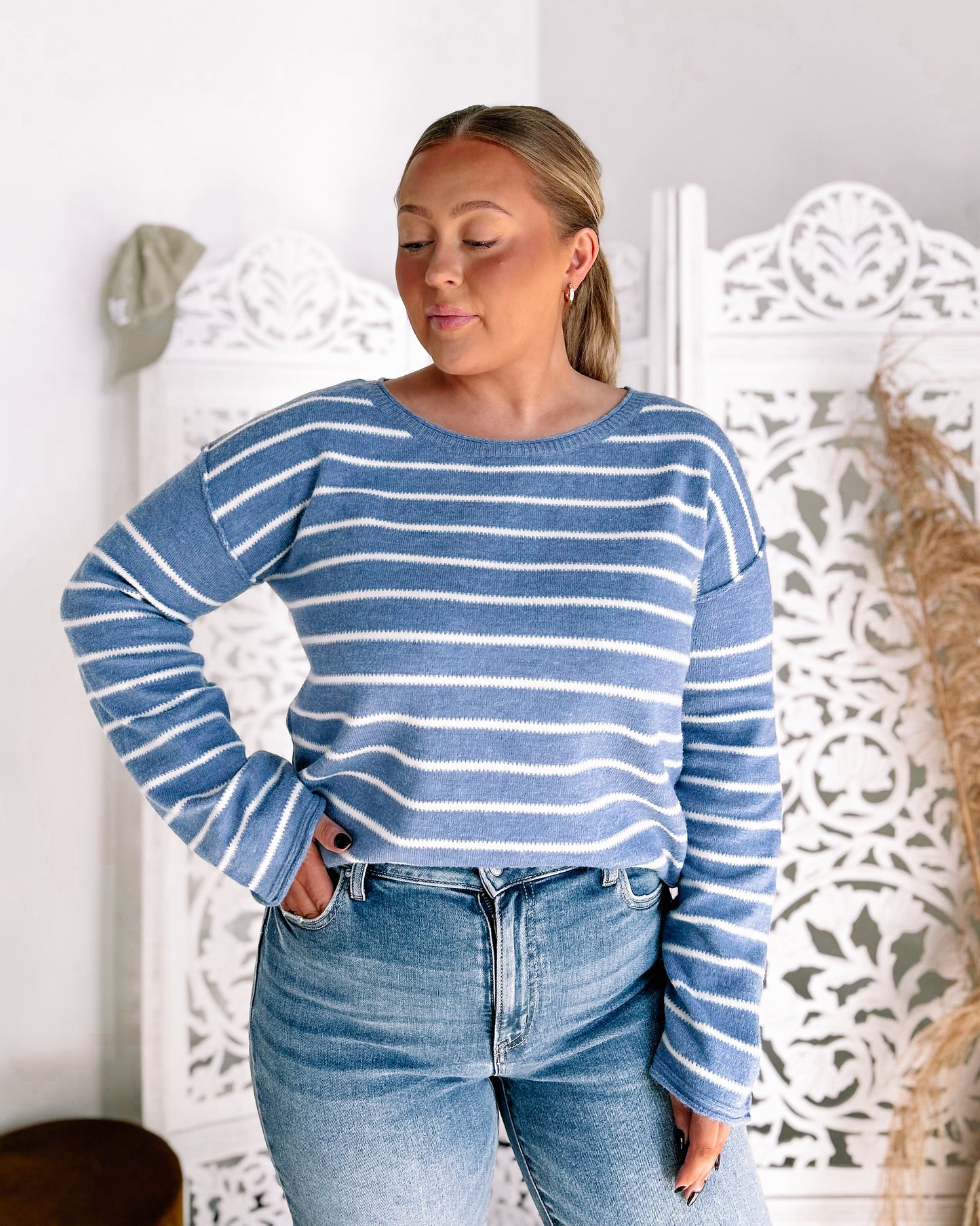 DETAILS: Embrace effortless style with this charming striped pullover that's ready for any season. Featuring a boat neck, and trendy drop sleeves. this sweater strikes the perfect balance between cozy comfort and laid-back sophistication.