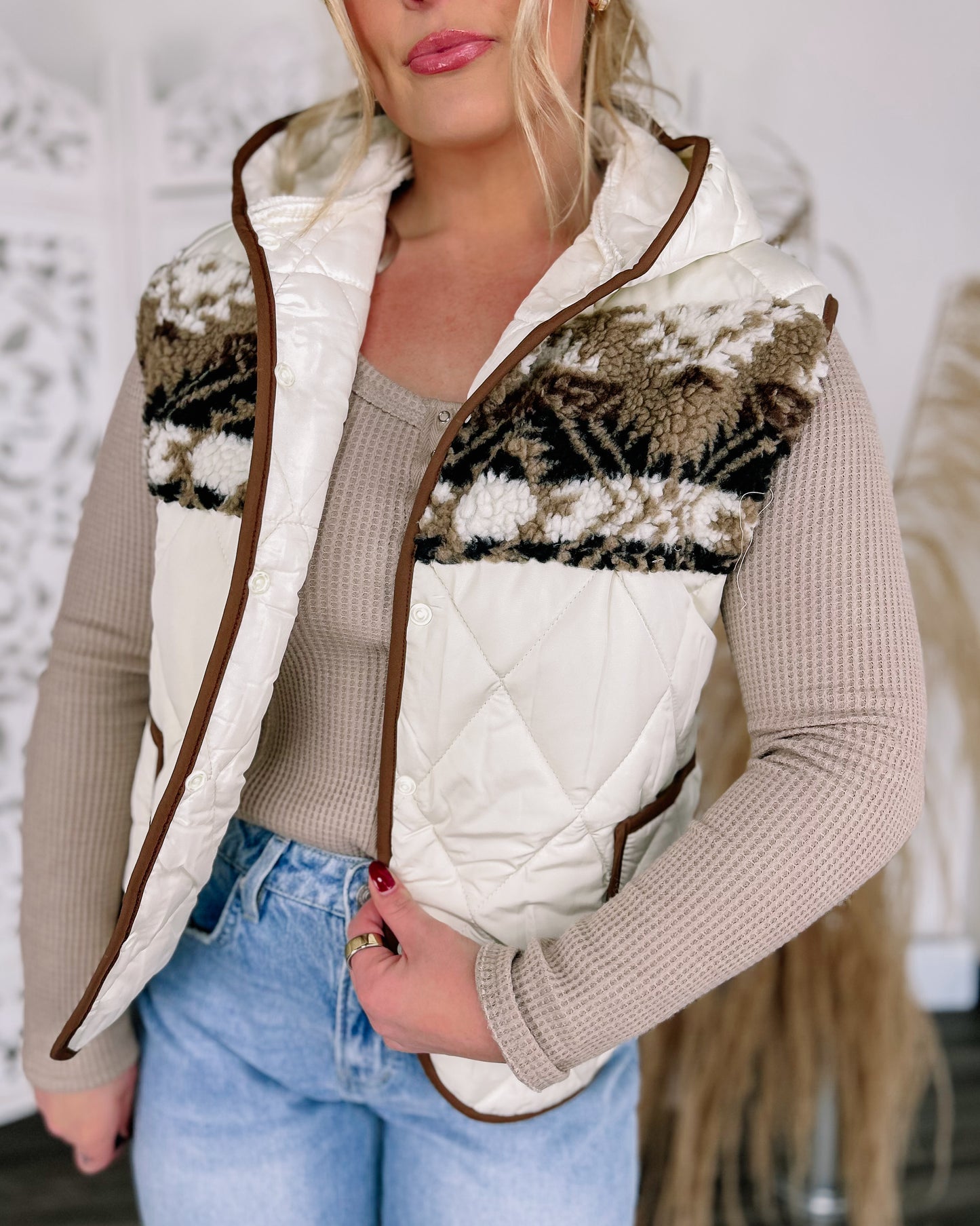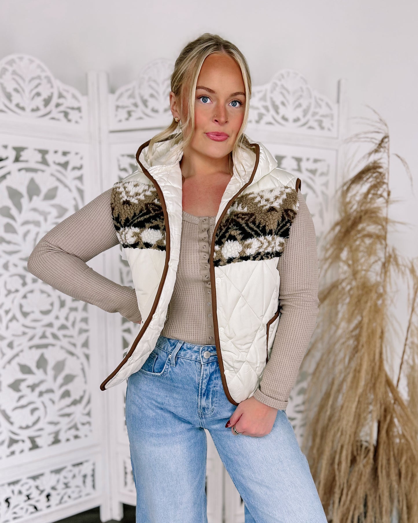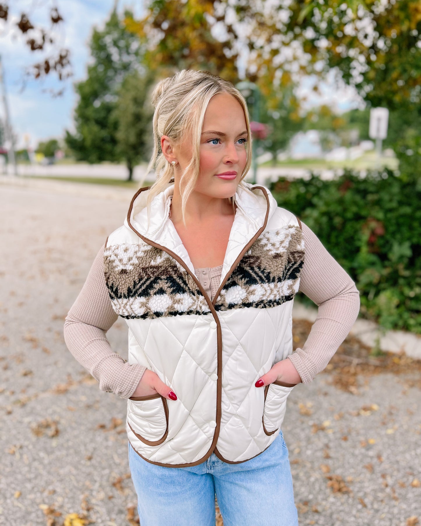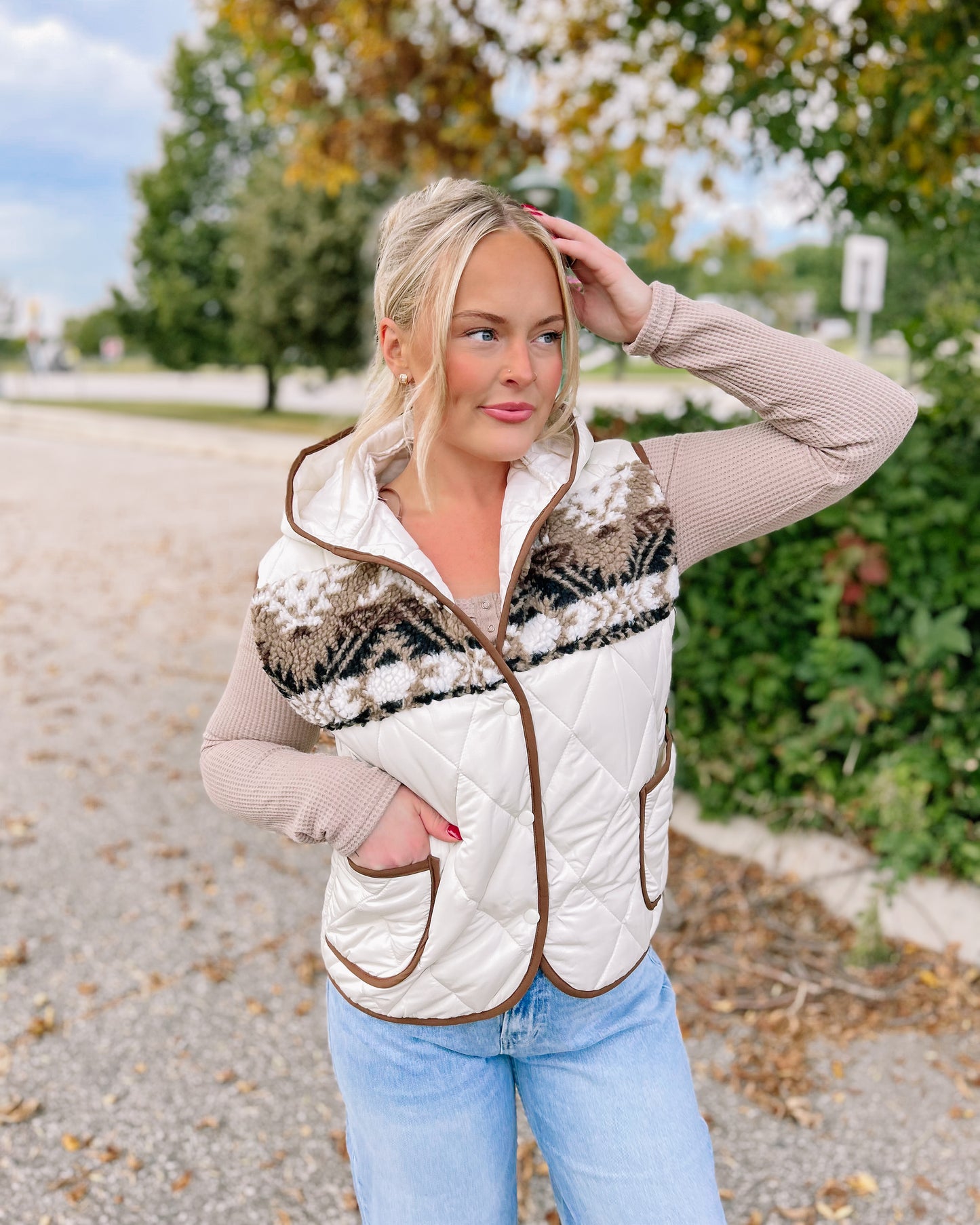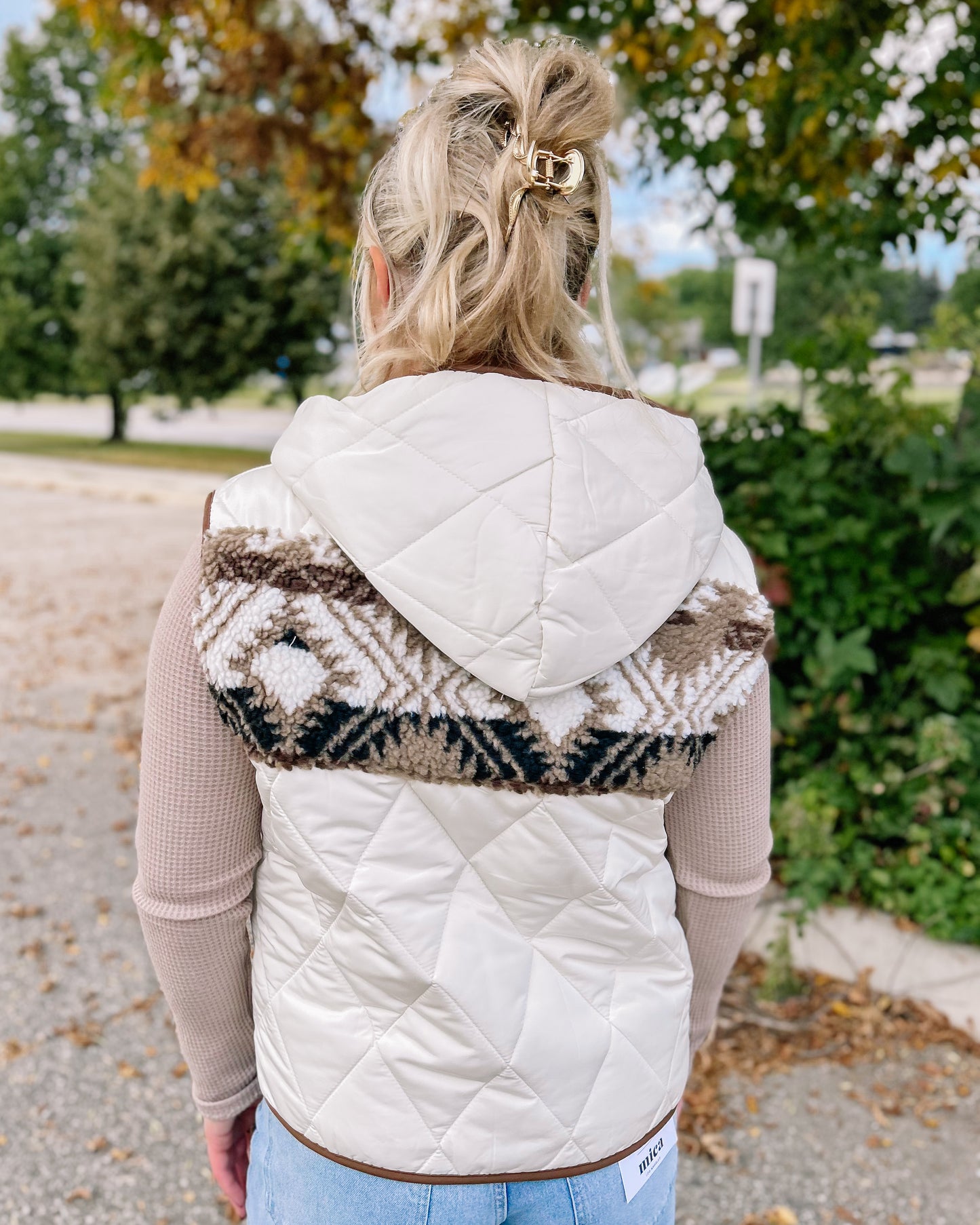 DETAILS: Cozy hooded quilted vest featuring a fun printed shearling trim—a perfect standout piece for fall and winter.