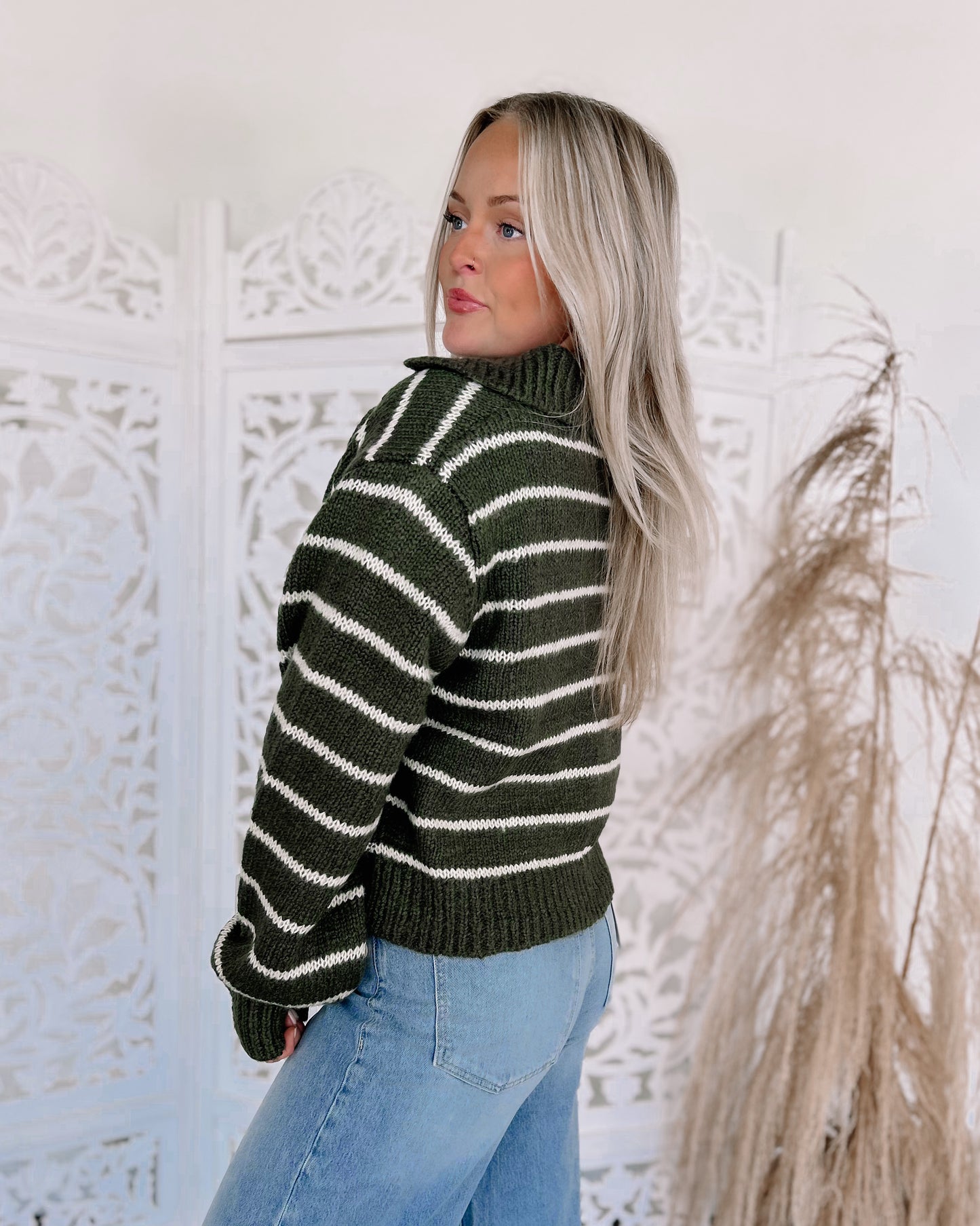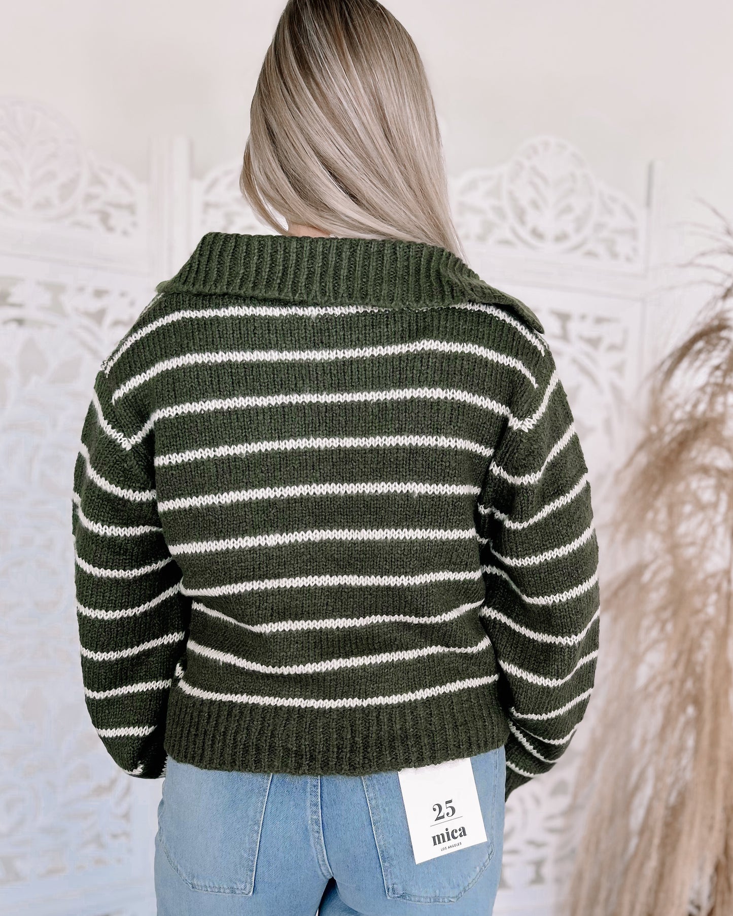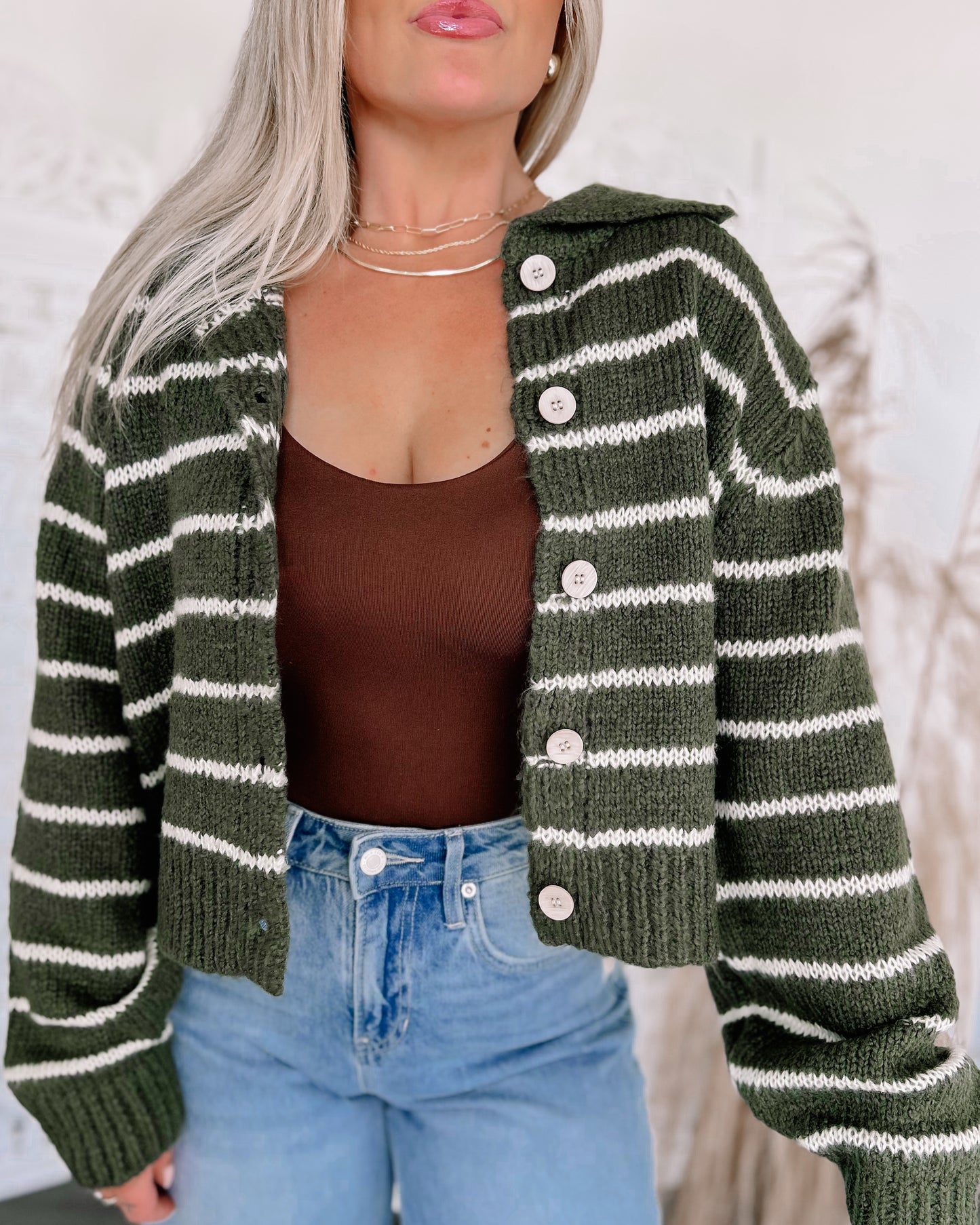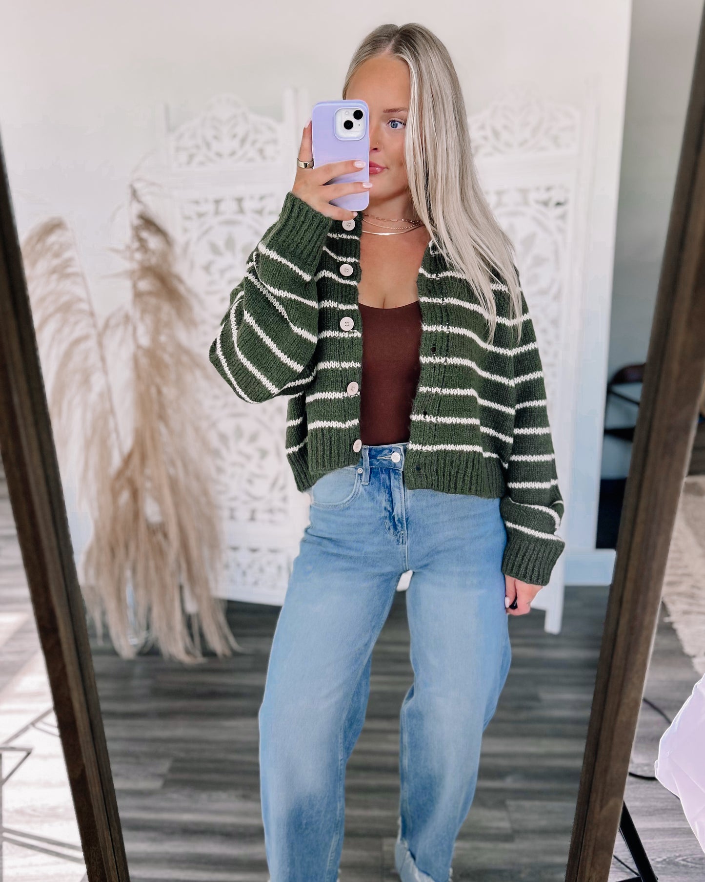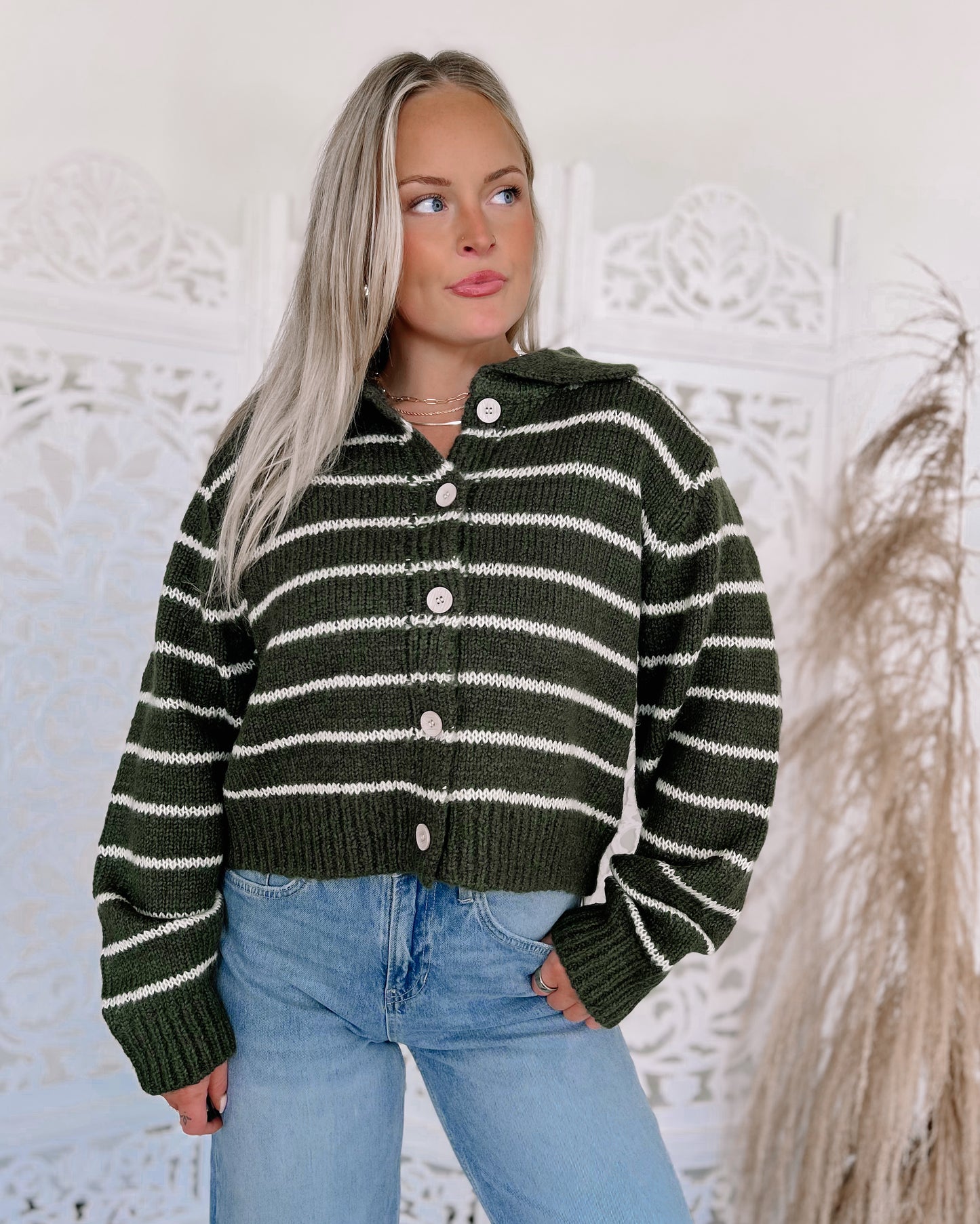 DETAILS: This striped button-up cardigan with a cute collar is your cozy fall must-have! Throw it over jeans for laid-back vibes or layer it on top of a dress to instantly up your autumn style game.