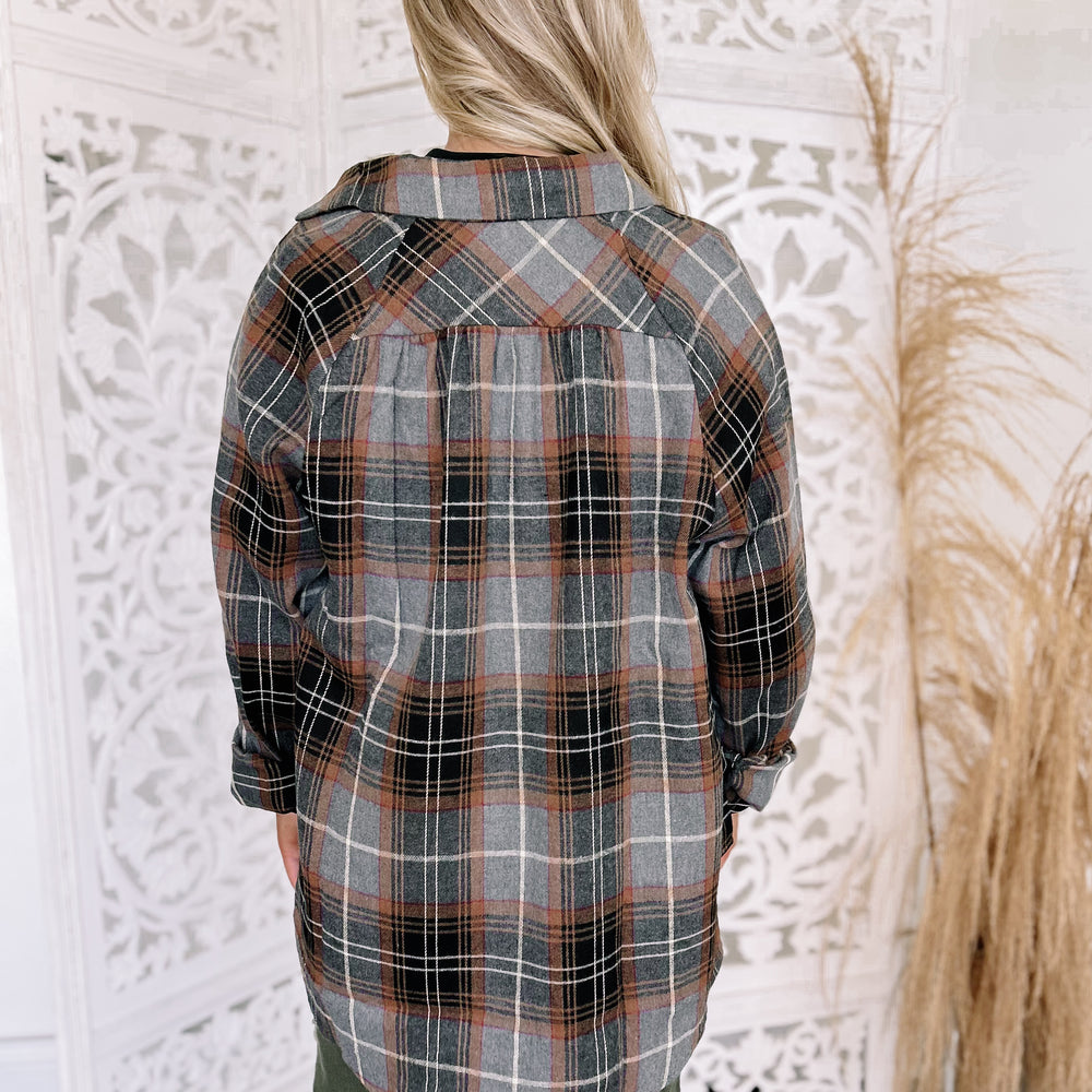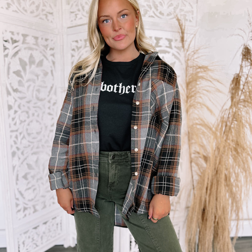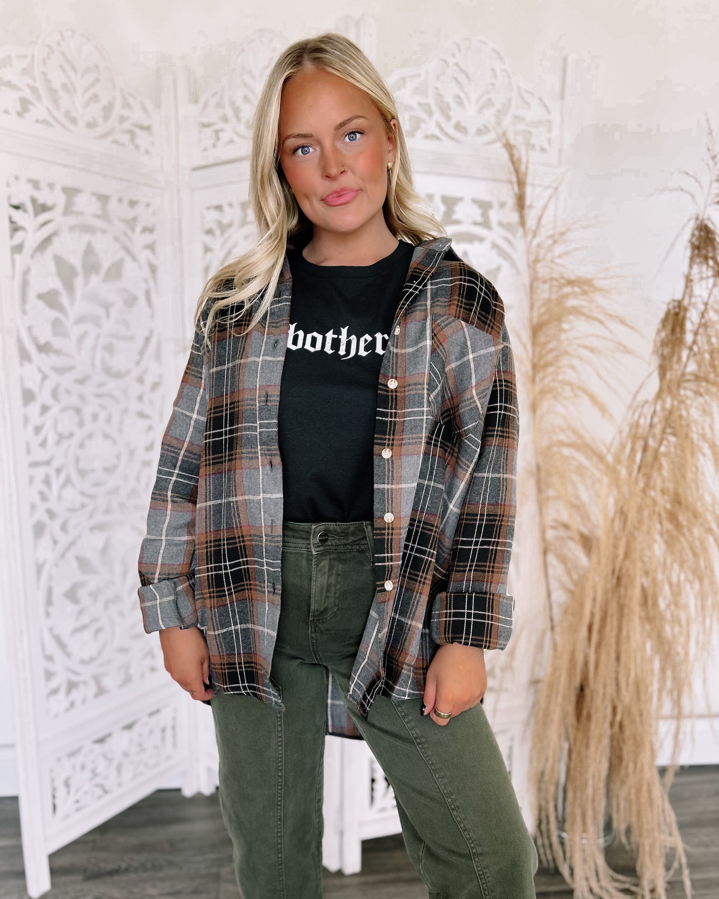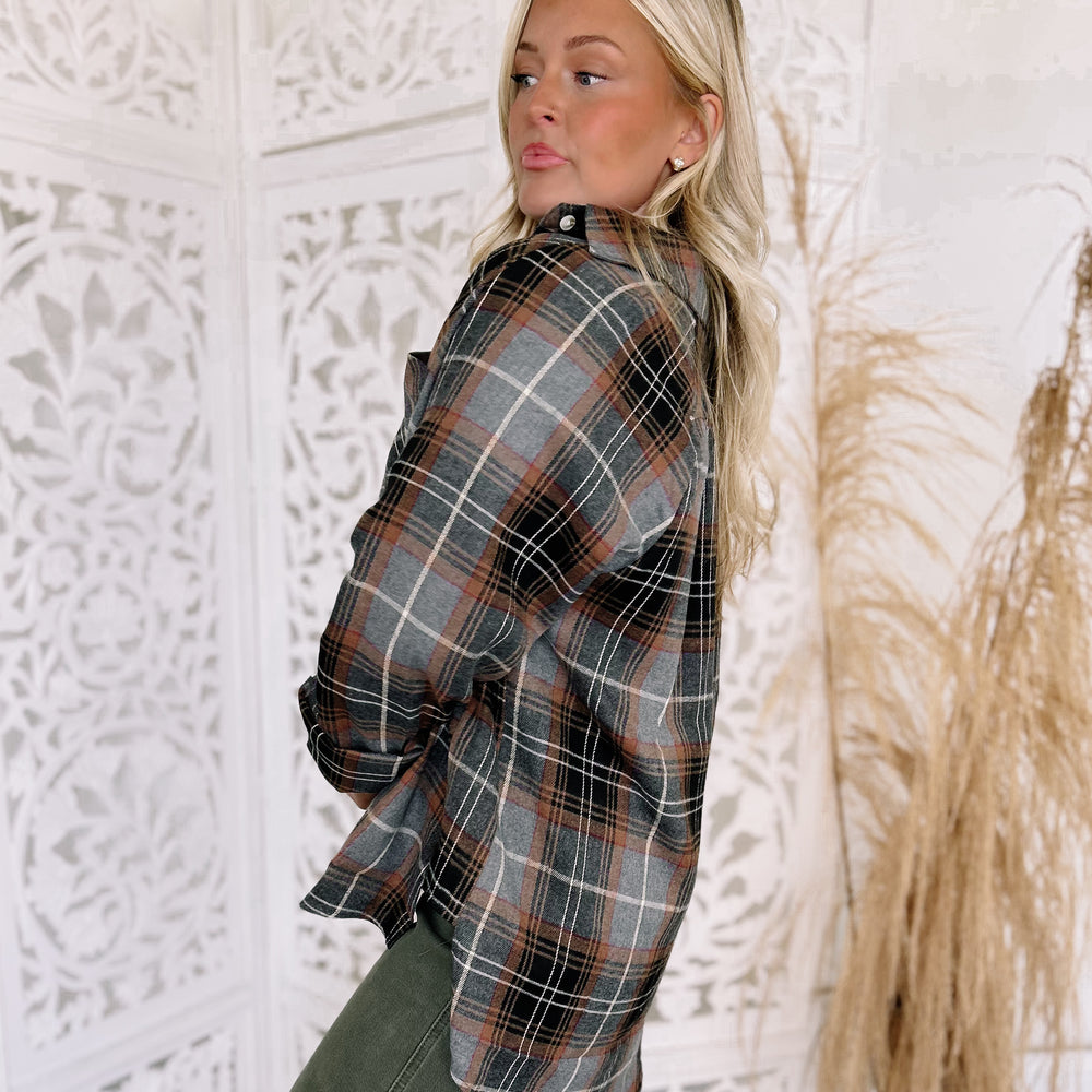 DETAILS: Wrap yourself in cozy comfort with the forrest forage flannel featuring a boxy silhouette adds a relaxed feel, while the side step hem brings a modern touch. Raglan sleeves enhance mobility, making it a perfect blend of style and functionality for chilly days.