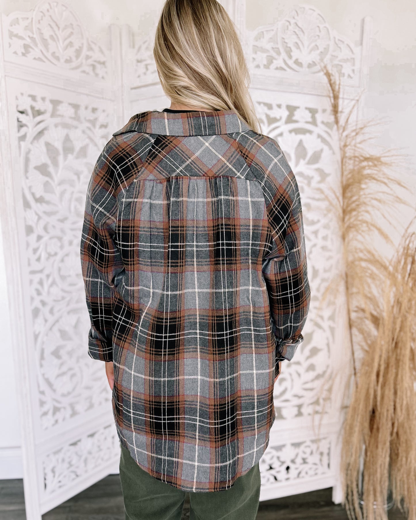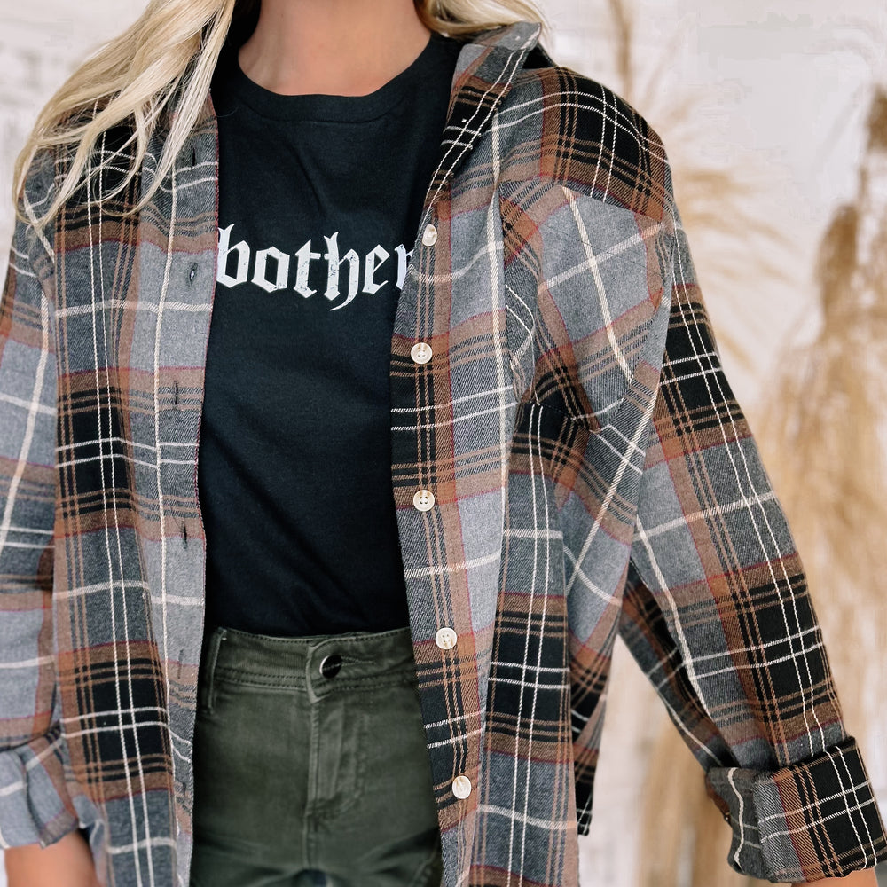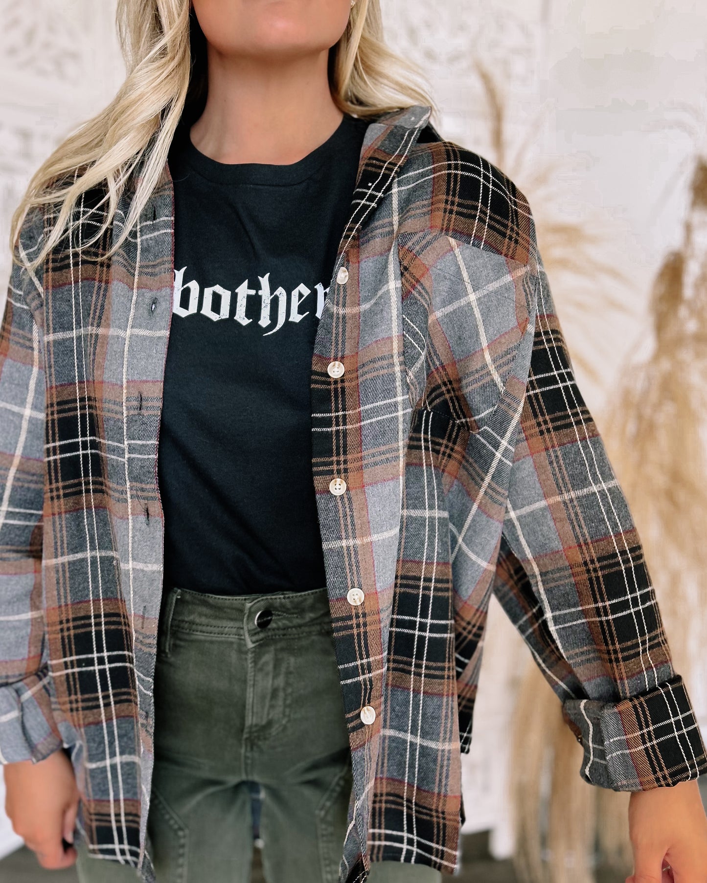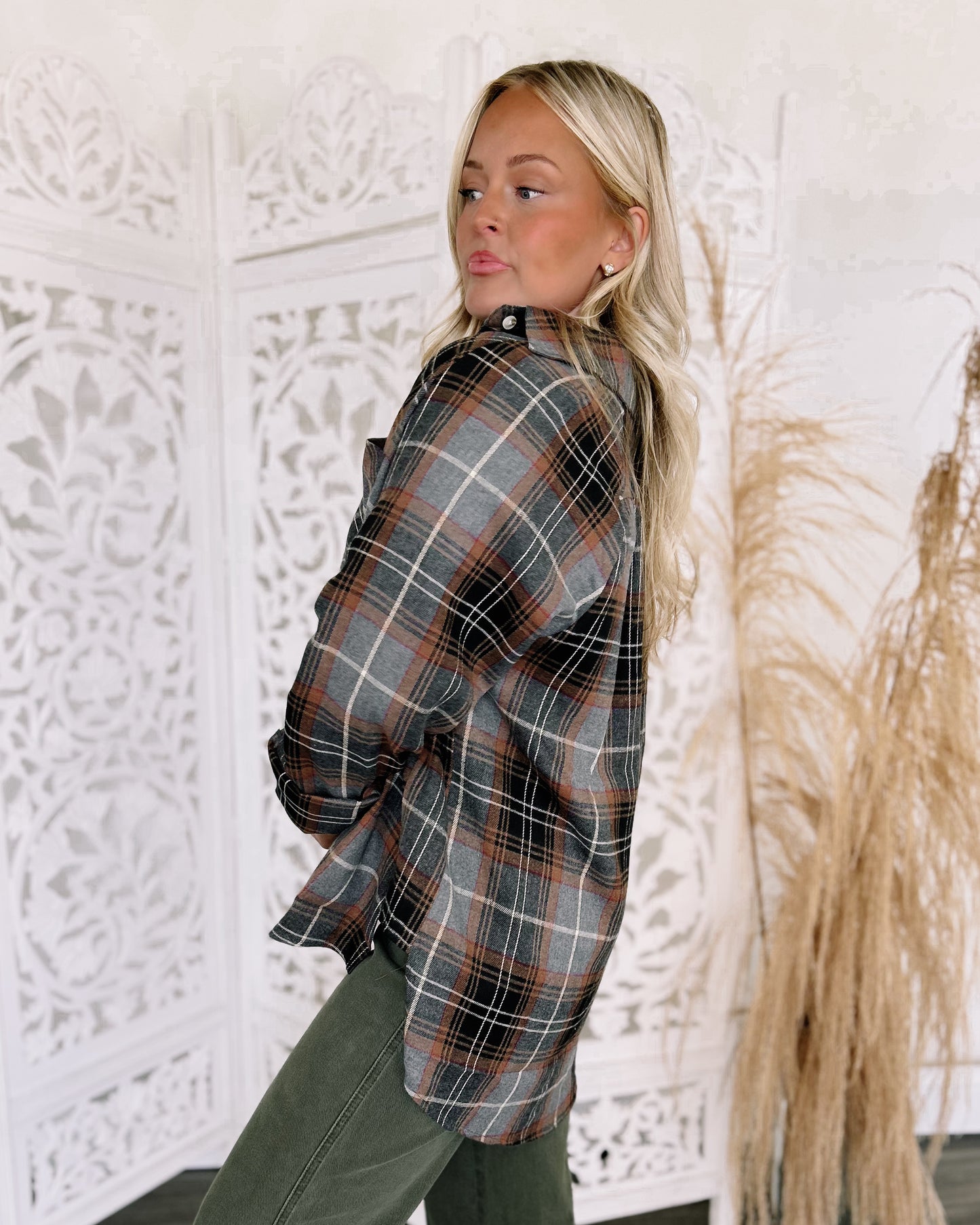 DETAILS: Wrap yourself in cozy comfort with the forrest forage flannel featuring a boxy silhouette adds a relaxed feel, while the side step hem brings a modern touch. Raglan sleeves enhance mobility, making it a perfect blend of style and functionality for chilly days.