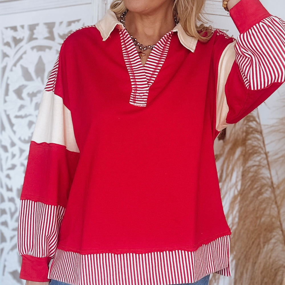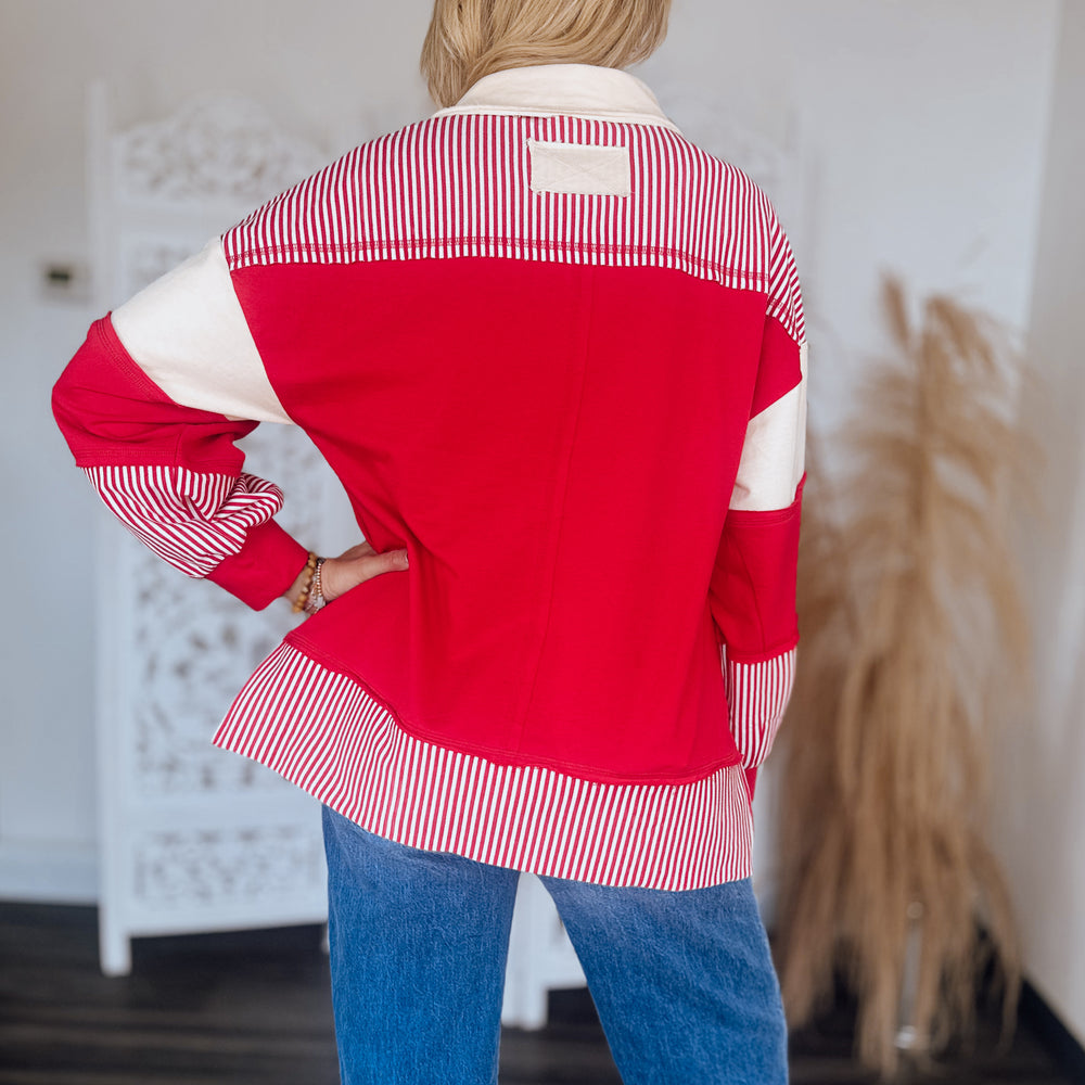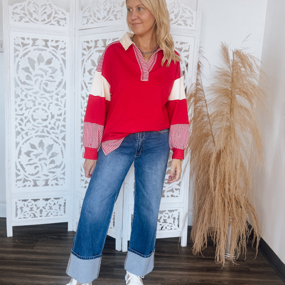 DETAILS: This playful oversized polo features long sleeves and a fun color block design in red and cream.