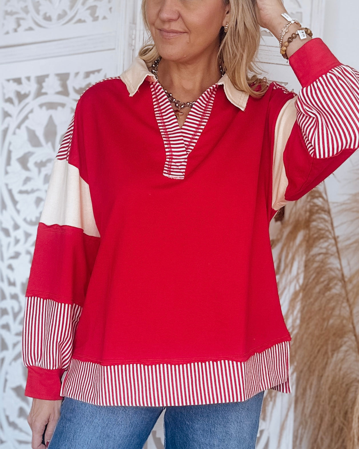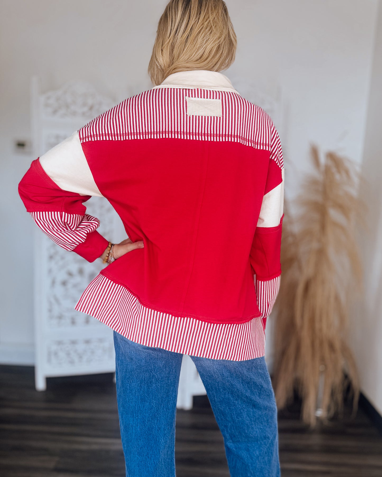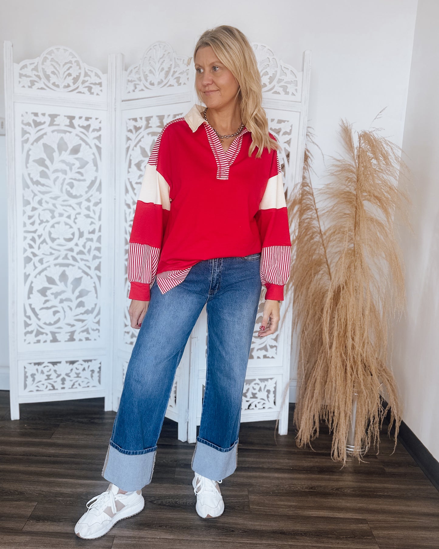 DETAILS: This playful oversized polo features long sleeves and a fun color block design in red and cream.