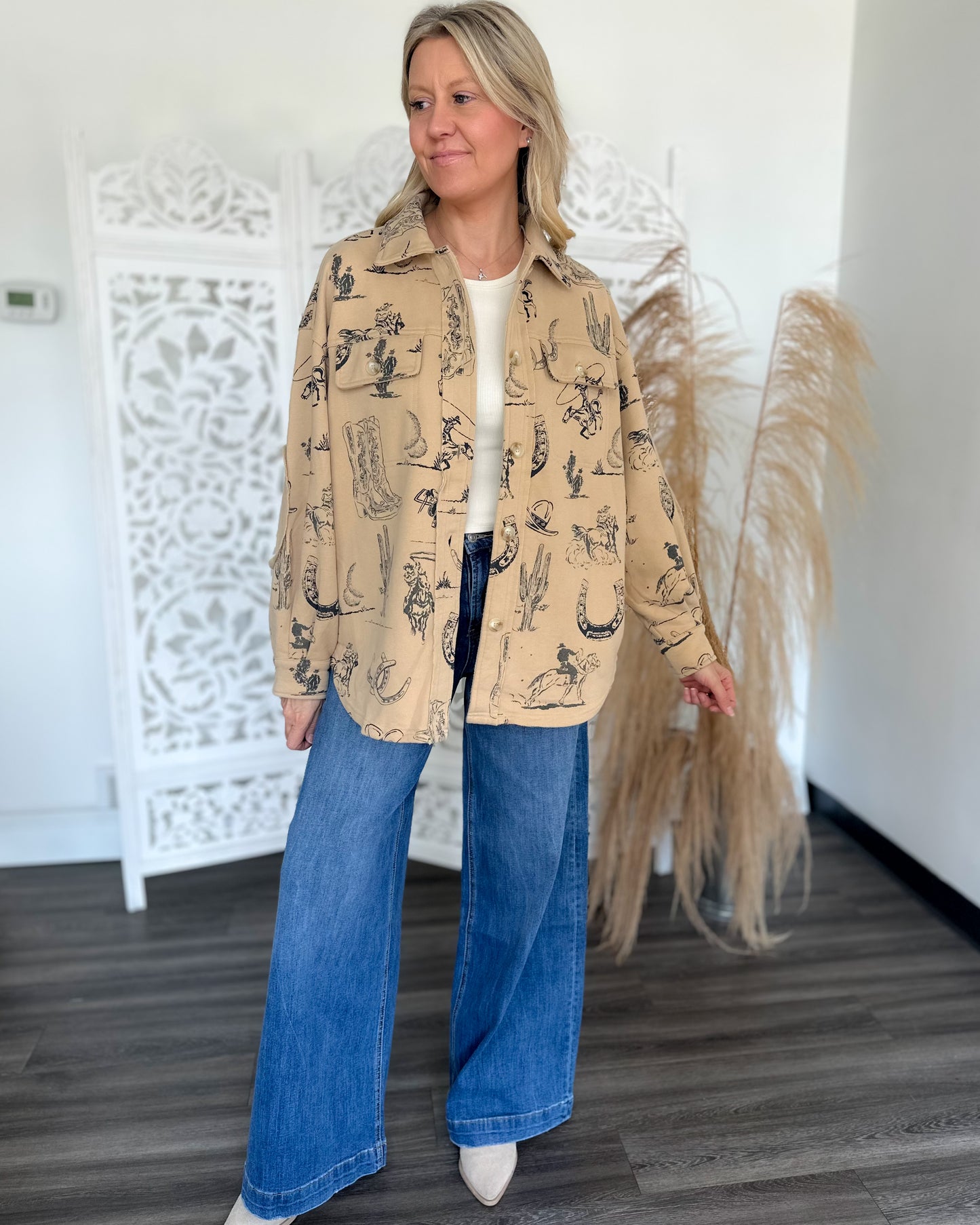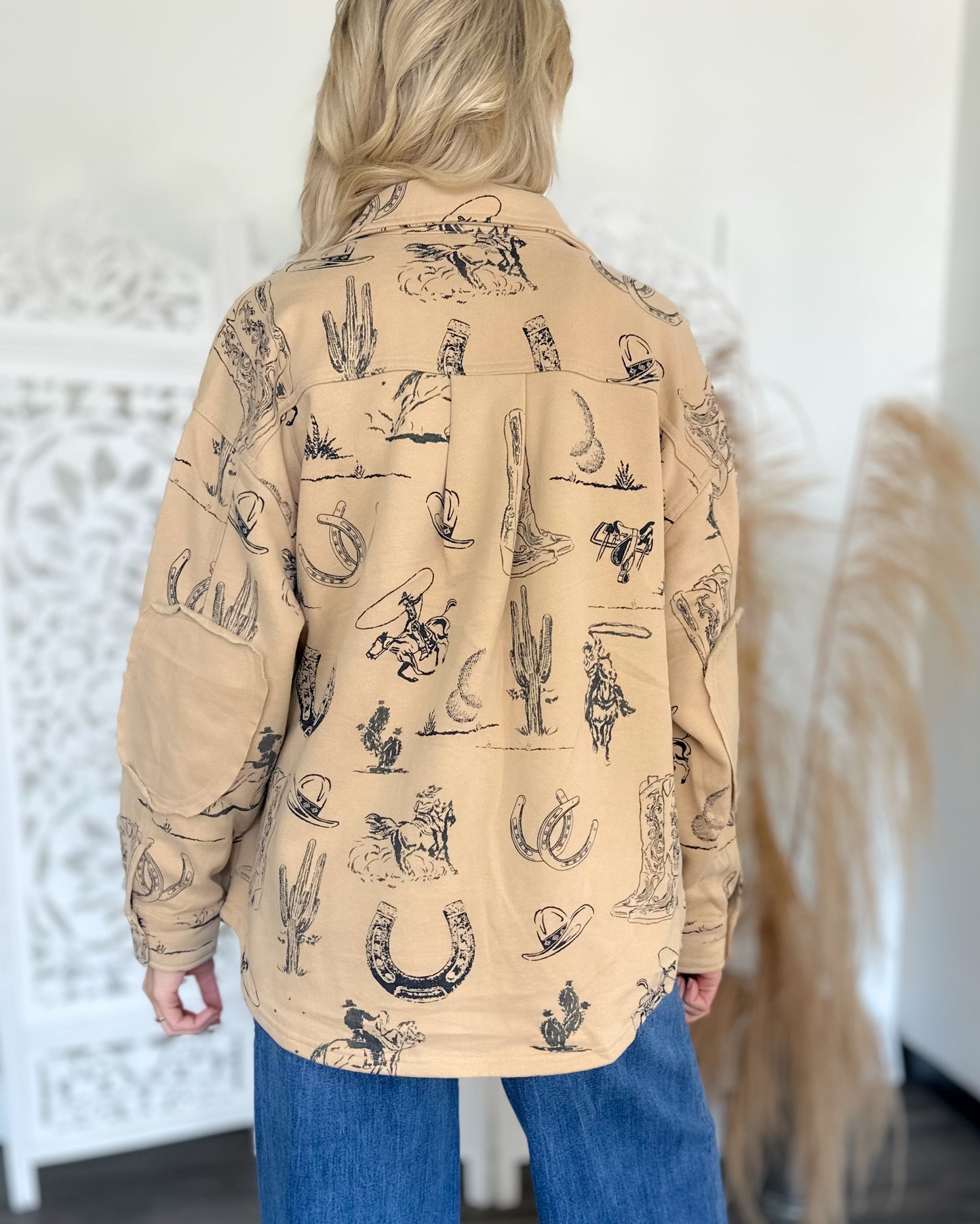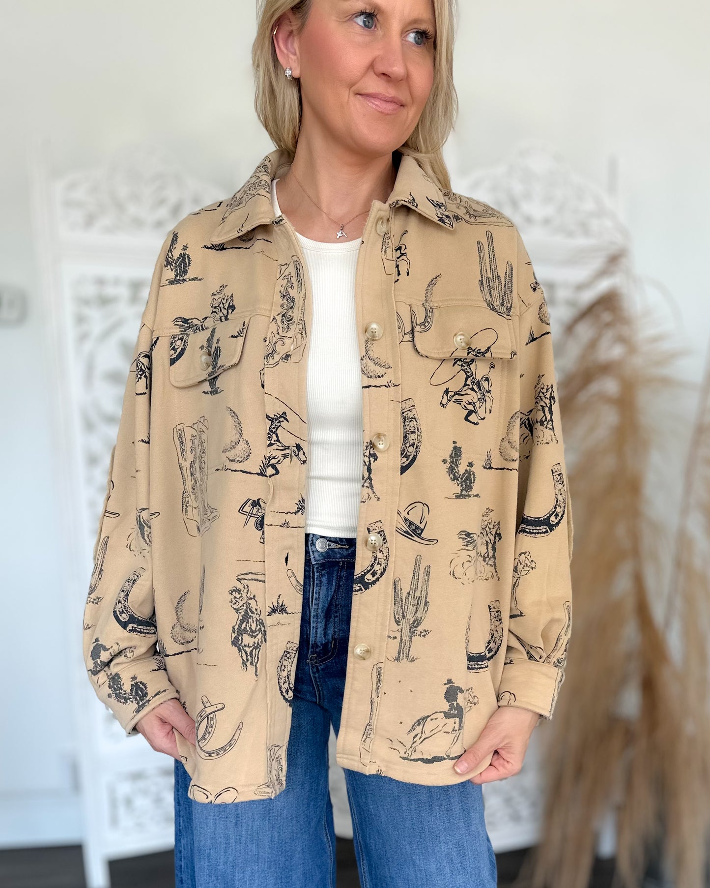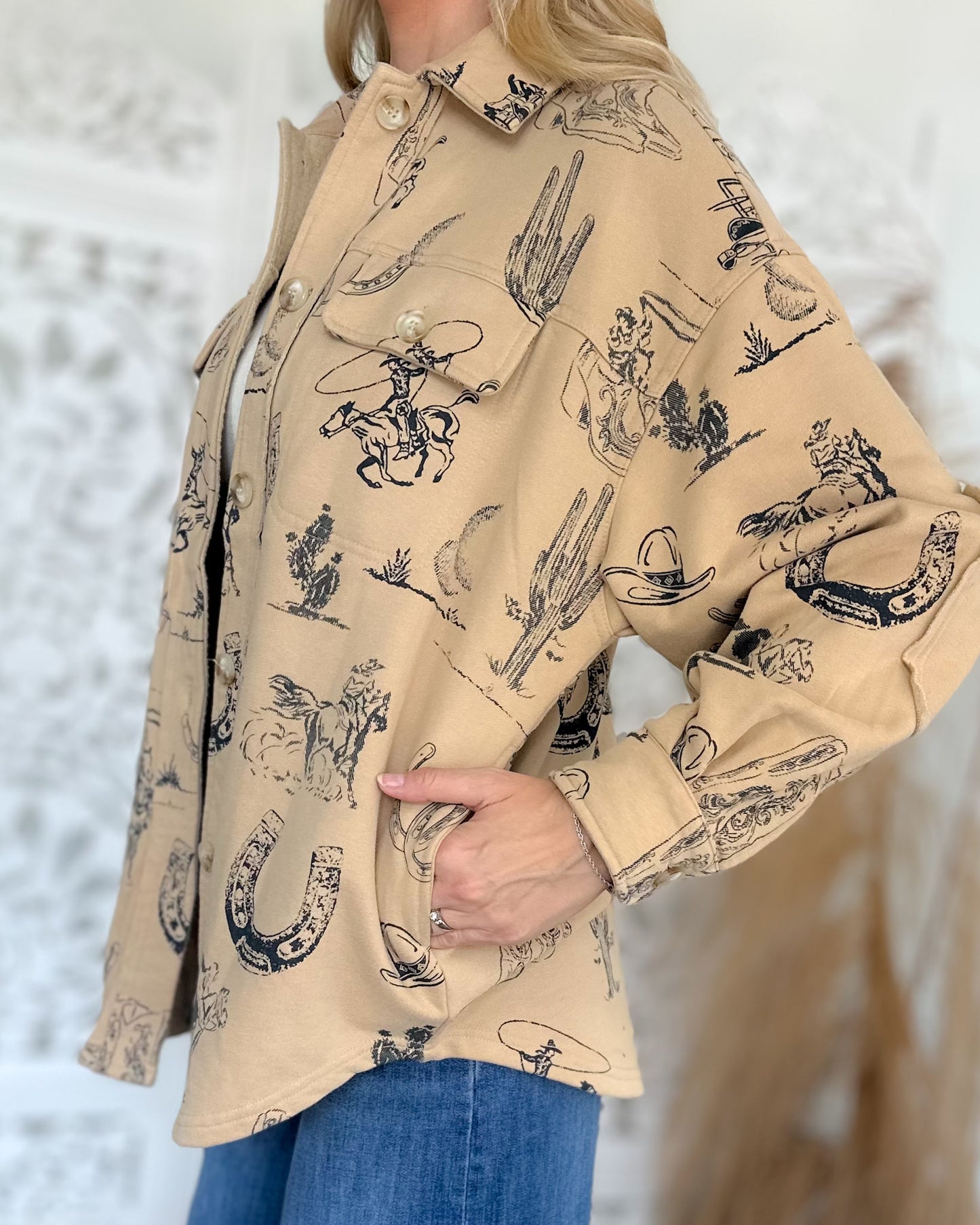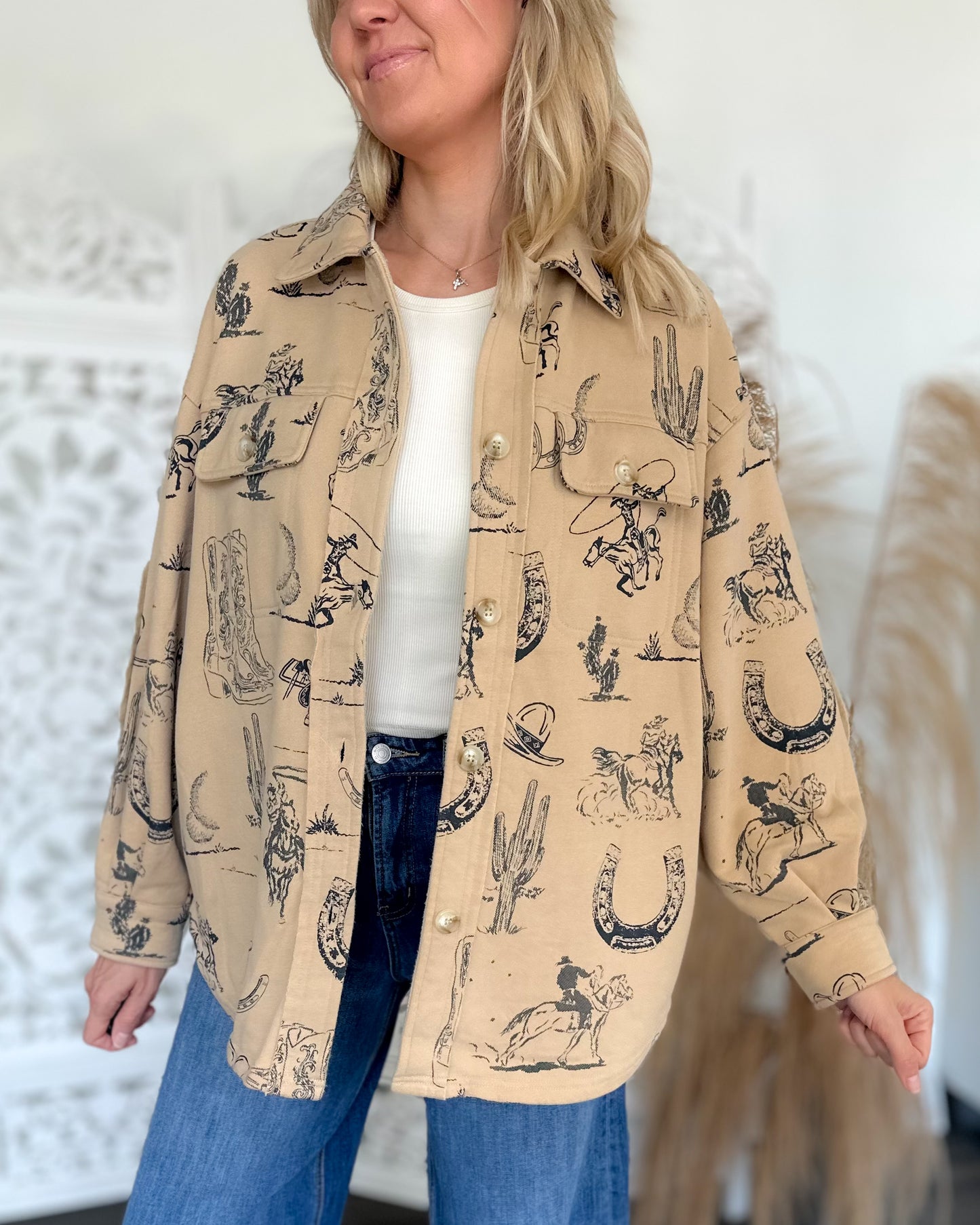 Wrap yourself in cozy western charm with the Save a horse Western Shacket in taupe. This super soft shacket features all-over western icons that bring playful spirit and style to your everyday look. Perfect for layering, it combines the warmth of a jacket with the comfort of a shirt, making it your go-to for crisp days and cool nights. Add a touch of fun to your wardrobe with this easy, breezy western-inspired essential.