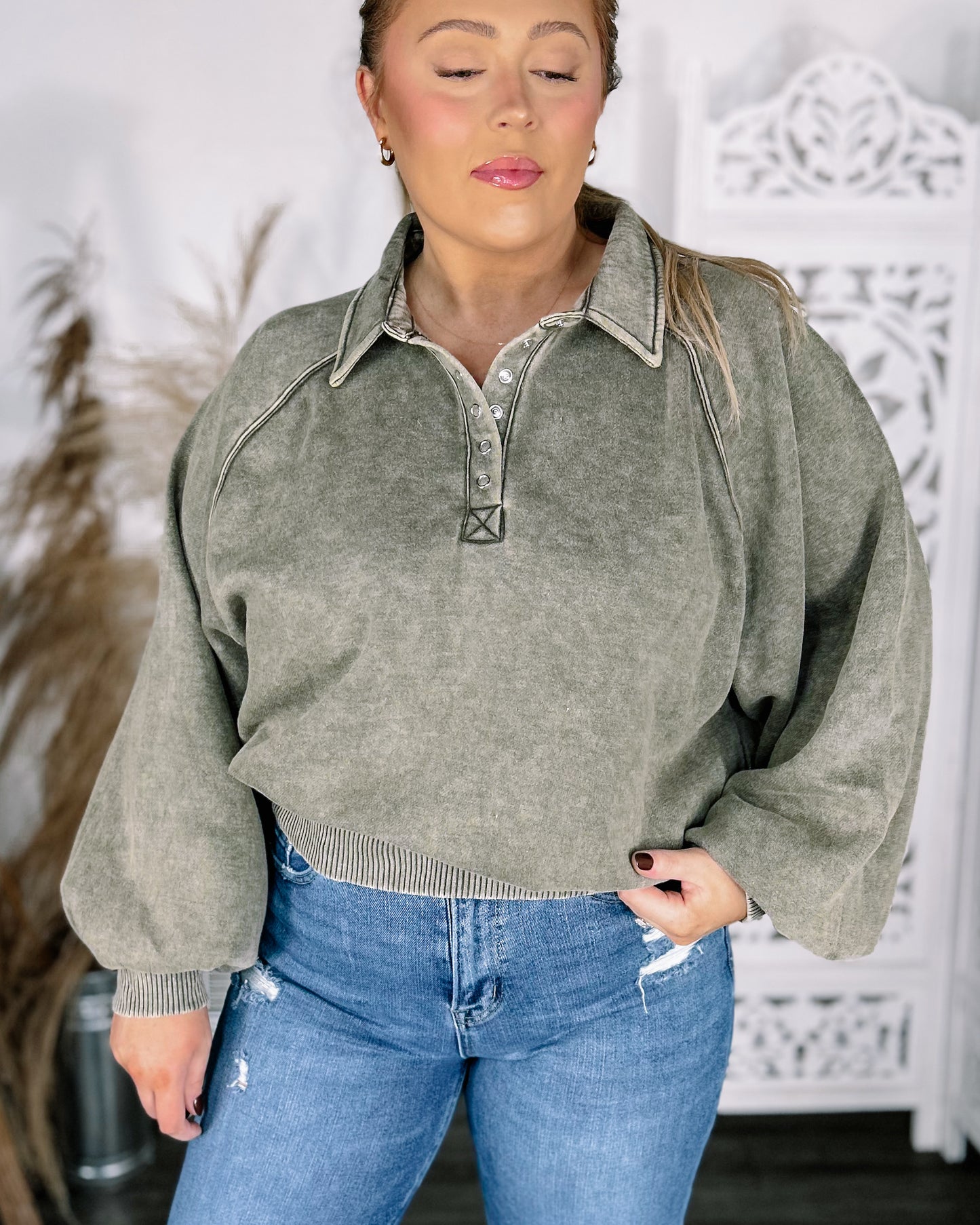 DETAILS:super soft elevated sweatshirt with snap buttons