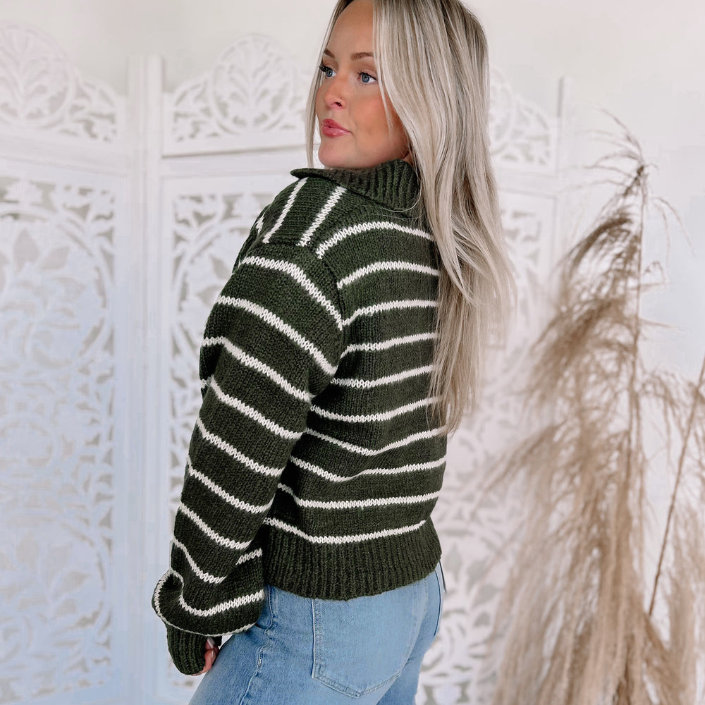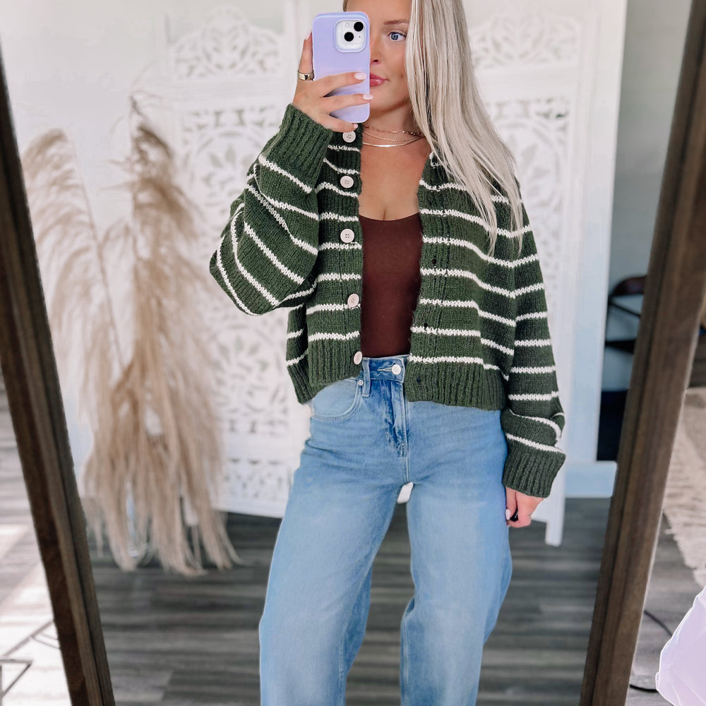 DETAILS: This striped button-up cardigan with a cute collar is your cozy fall must-have! Throw it over jeans for laid-back vibes or layer it on top of a dress to instantly up your autumn style game.