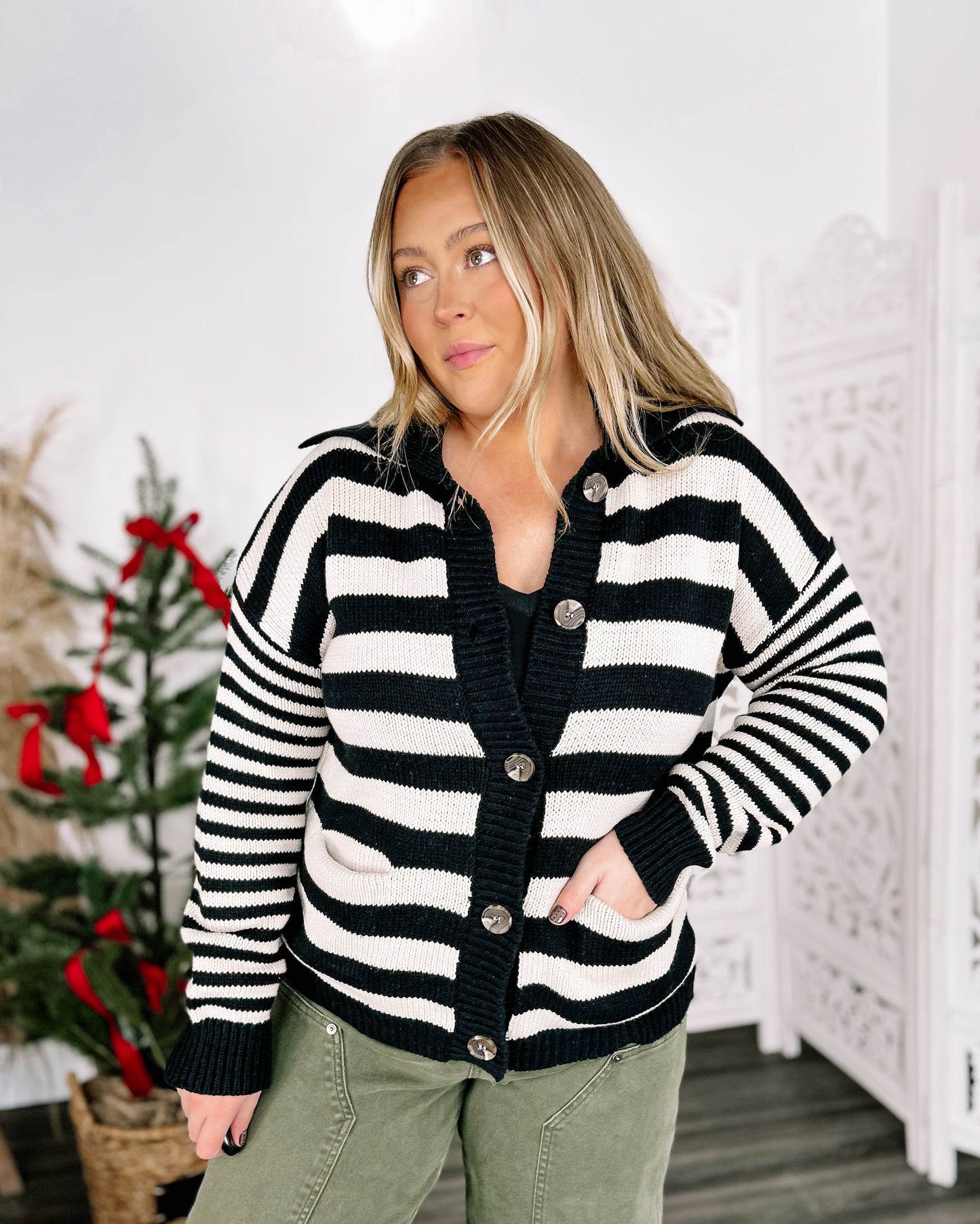 DETAILS: This charming sailor collard sweater cardigan brings a fun flair to your wardrobe with its classic collar, functional buttons, and handy pockets. Perfect for layering over your favorite tees or wear it alone as a sweater.