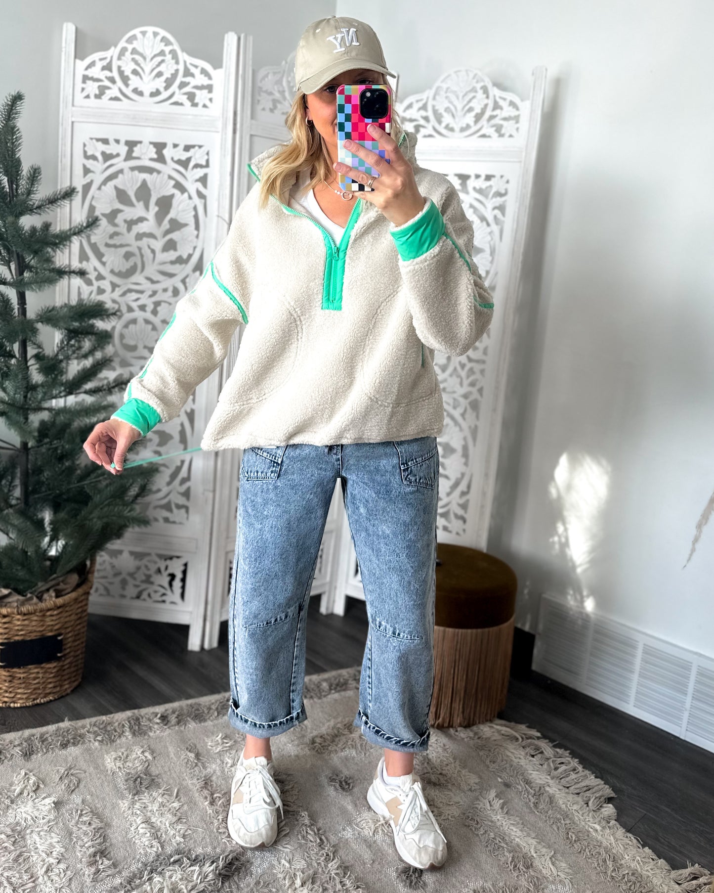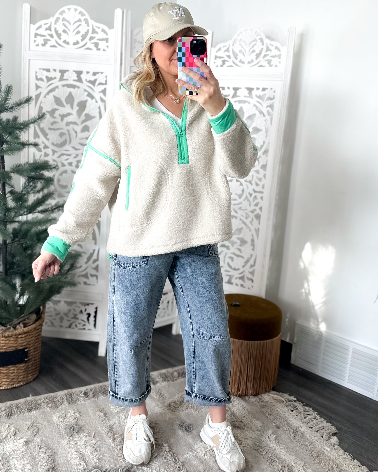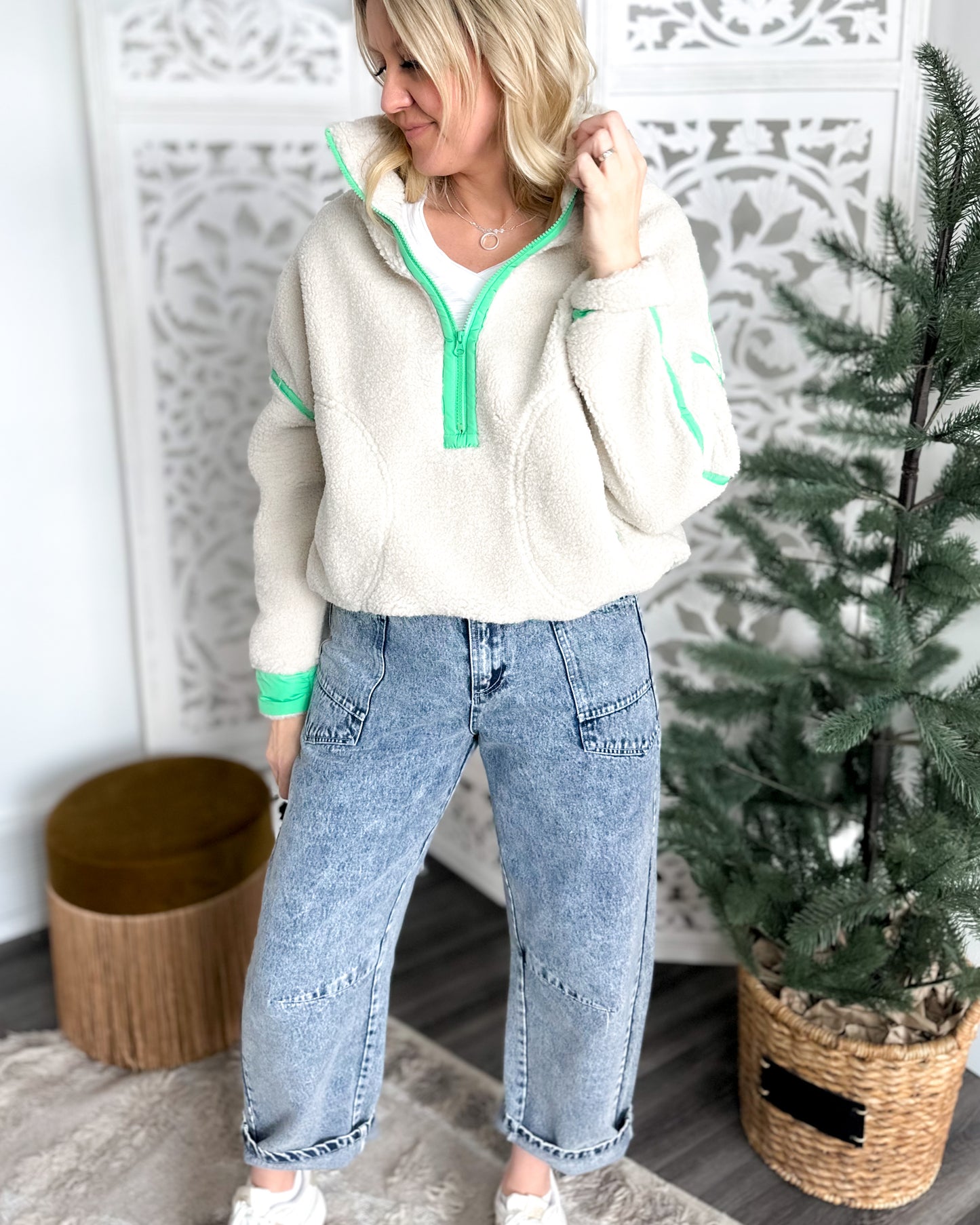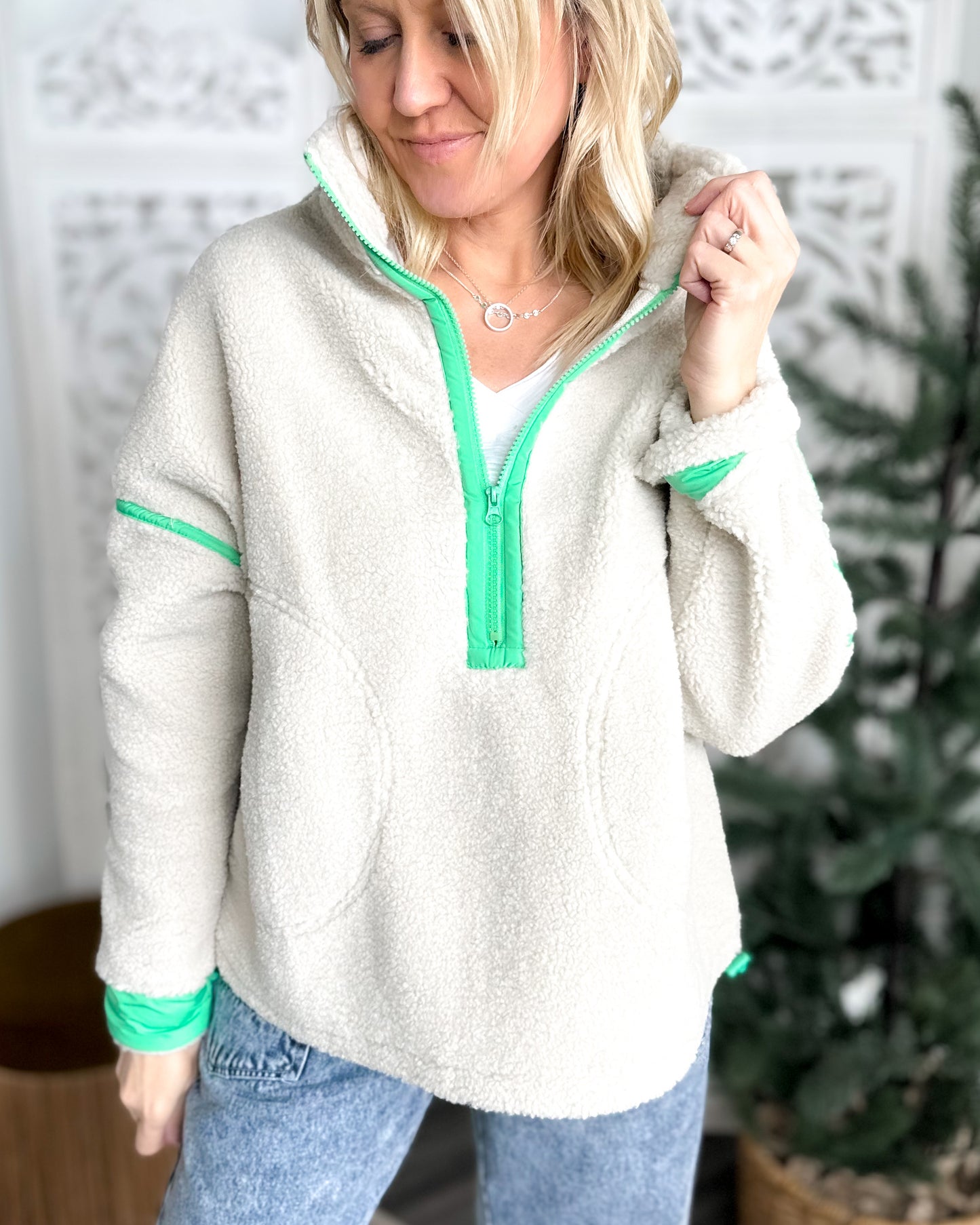 DETAILS: Cozy meets cool with this half-zip sherpa pullover that's ready for running errands, dropping the kids off at school, to coffee with your girlfriends.