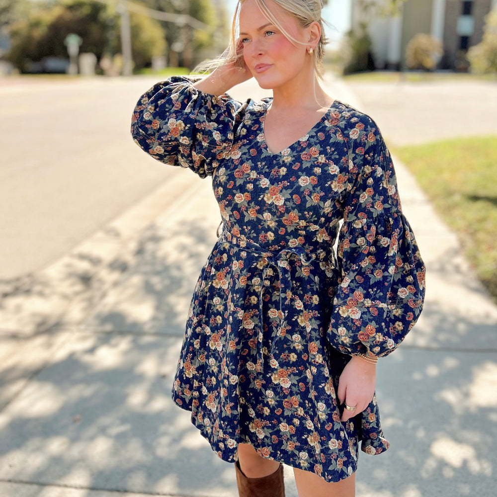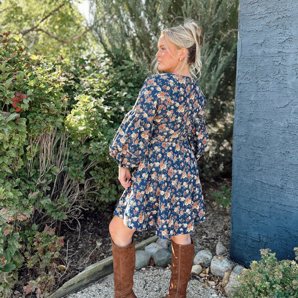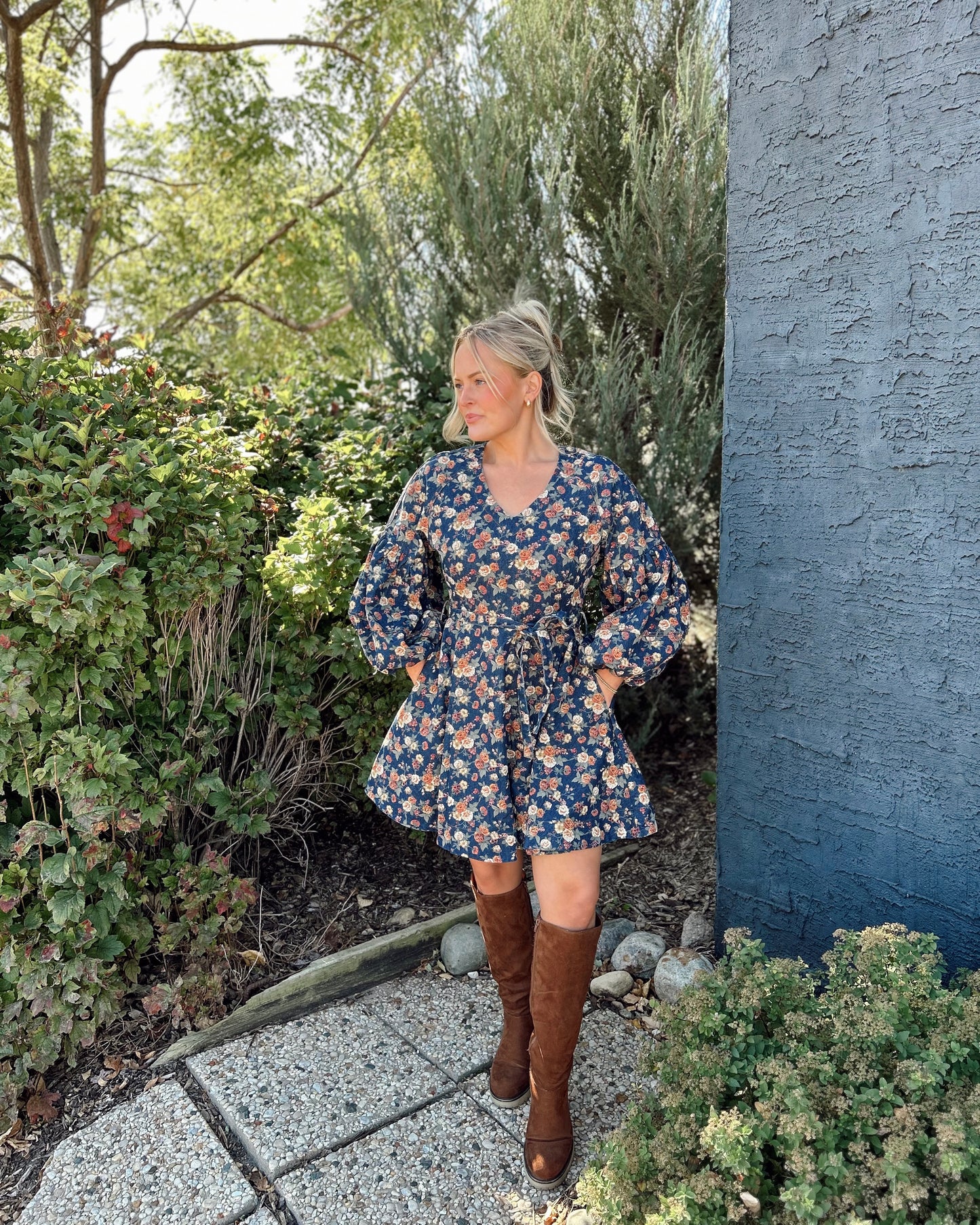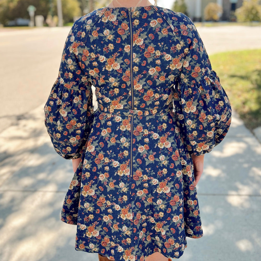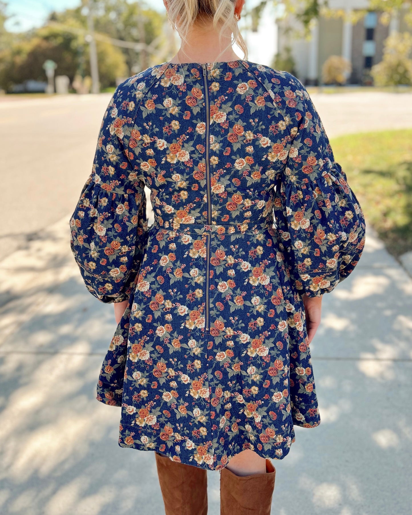 DETAILS: This playful denim dress features a lively floral print, charming balloon sleeves, and a flattering V-neckline. Its mini length hits at the thigh, accented by a waist-tie for a fun, flirty fit.