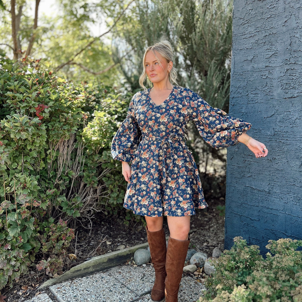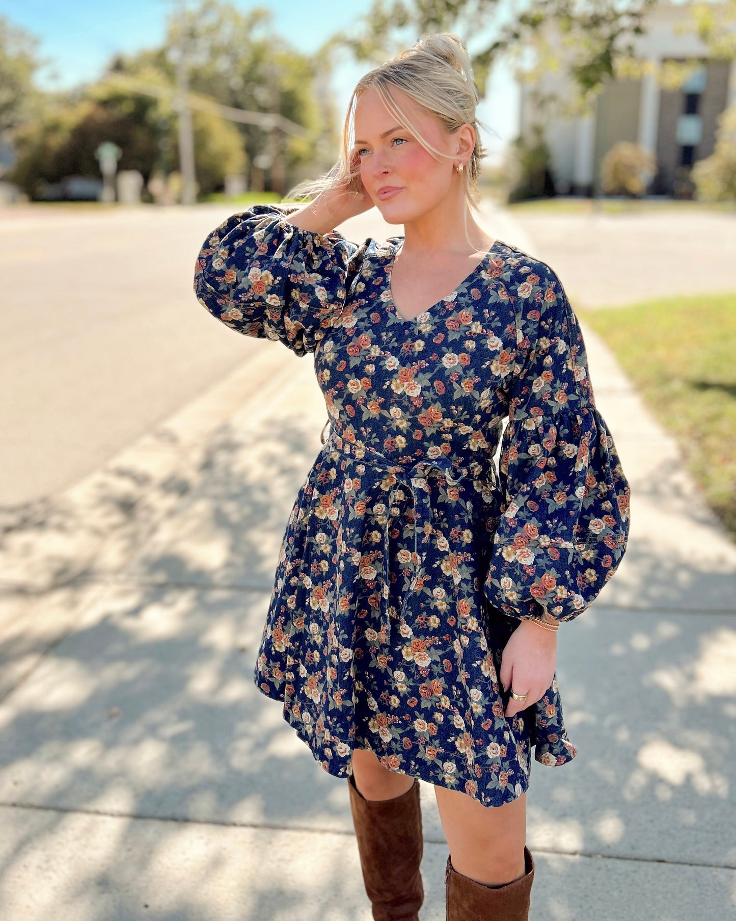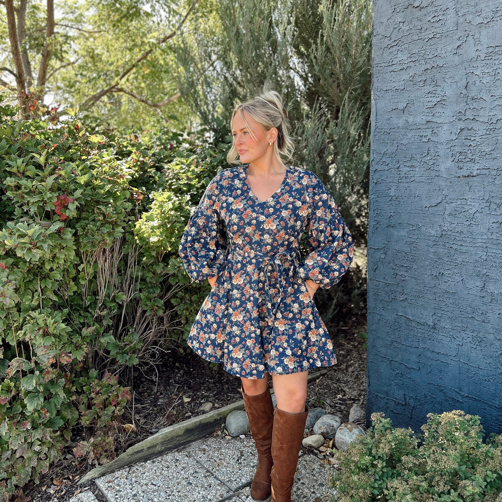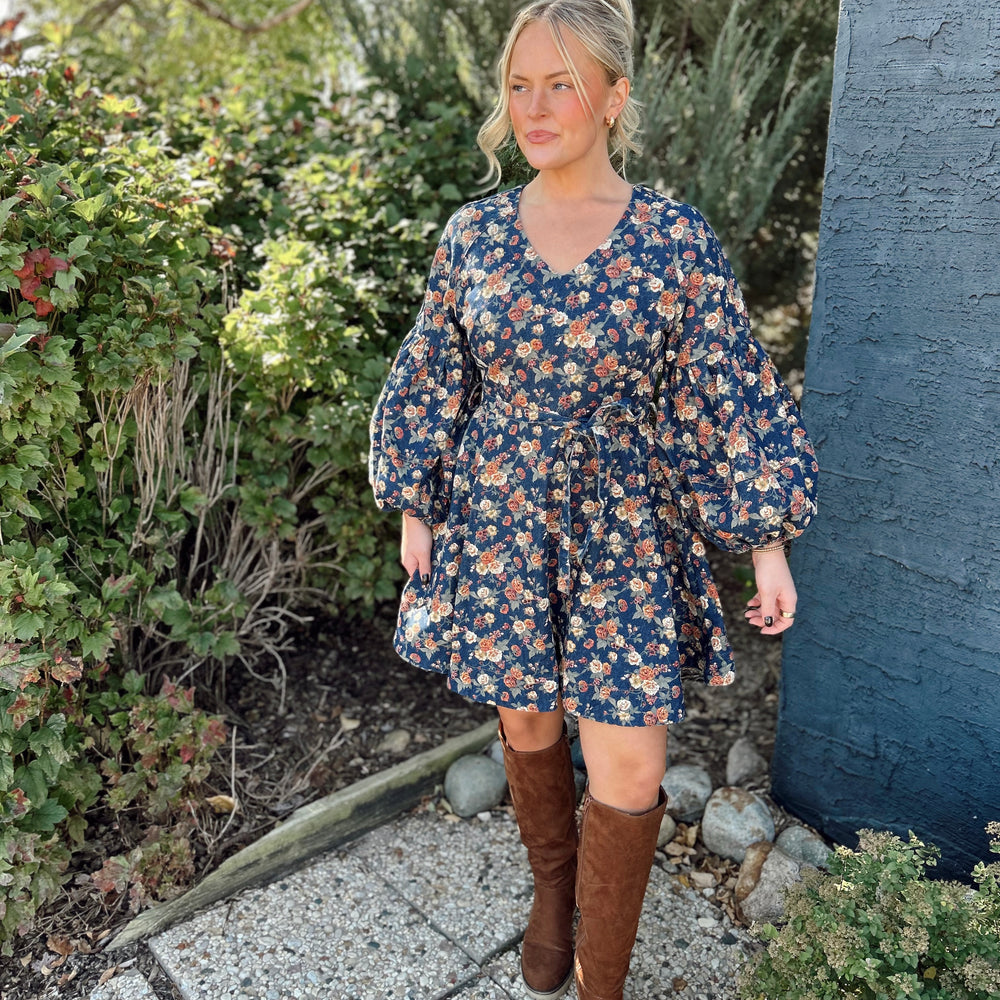 DETAILS: This playful denim dress features a lively floral print, charming balloon sleeves, and a flattering V-neckline. Its mini length hits at the thigh, accented by a waist-tie for a fun, flirty fit.