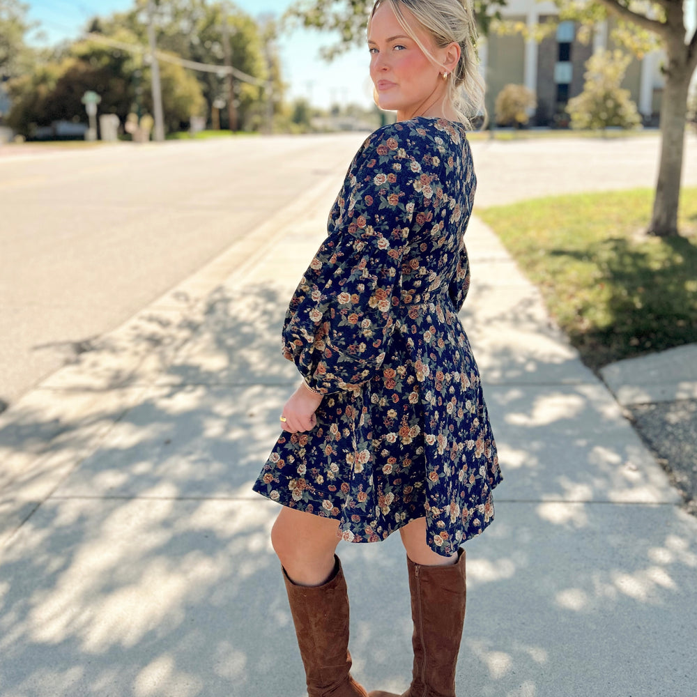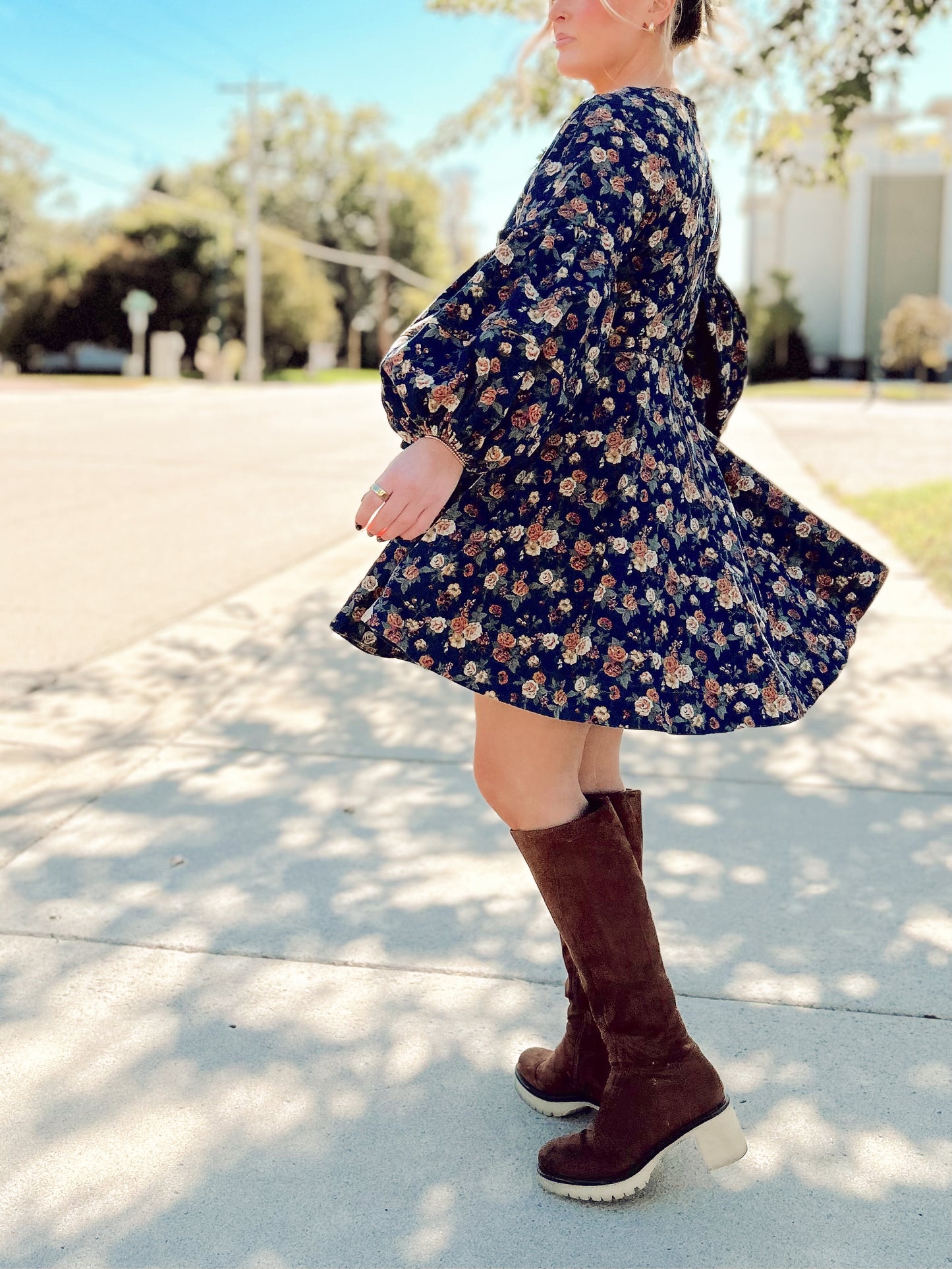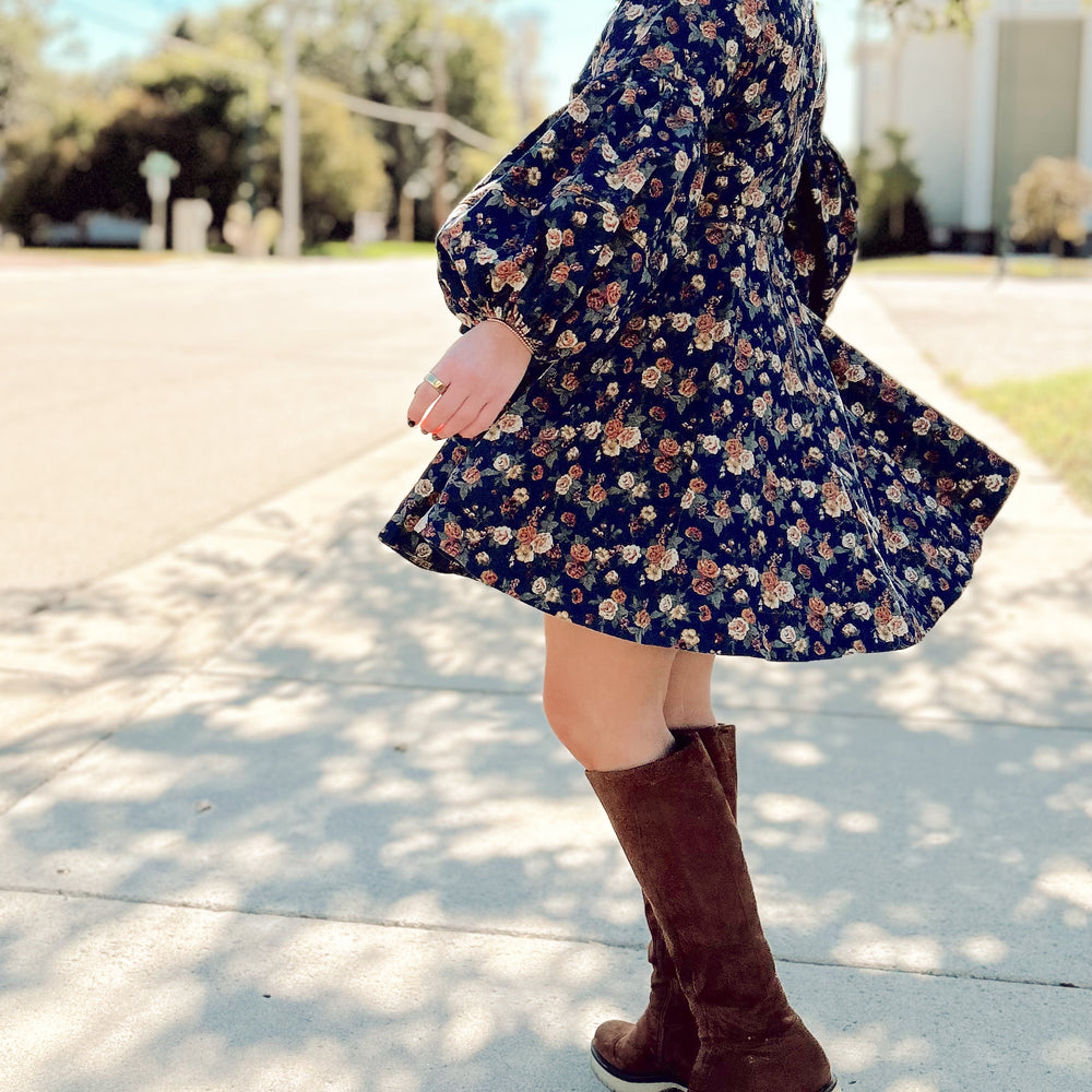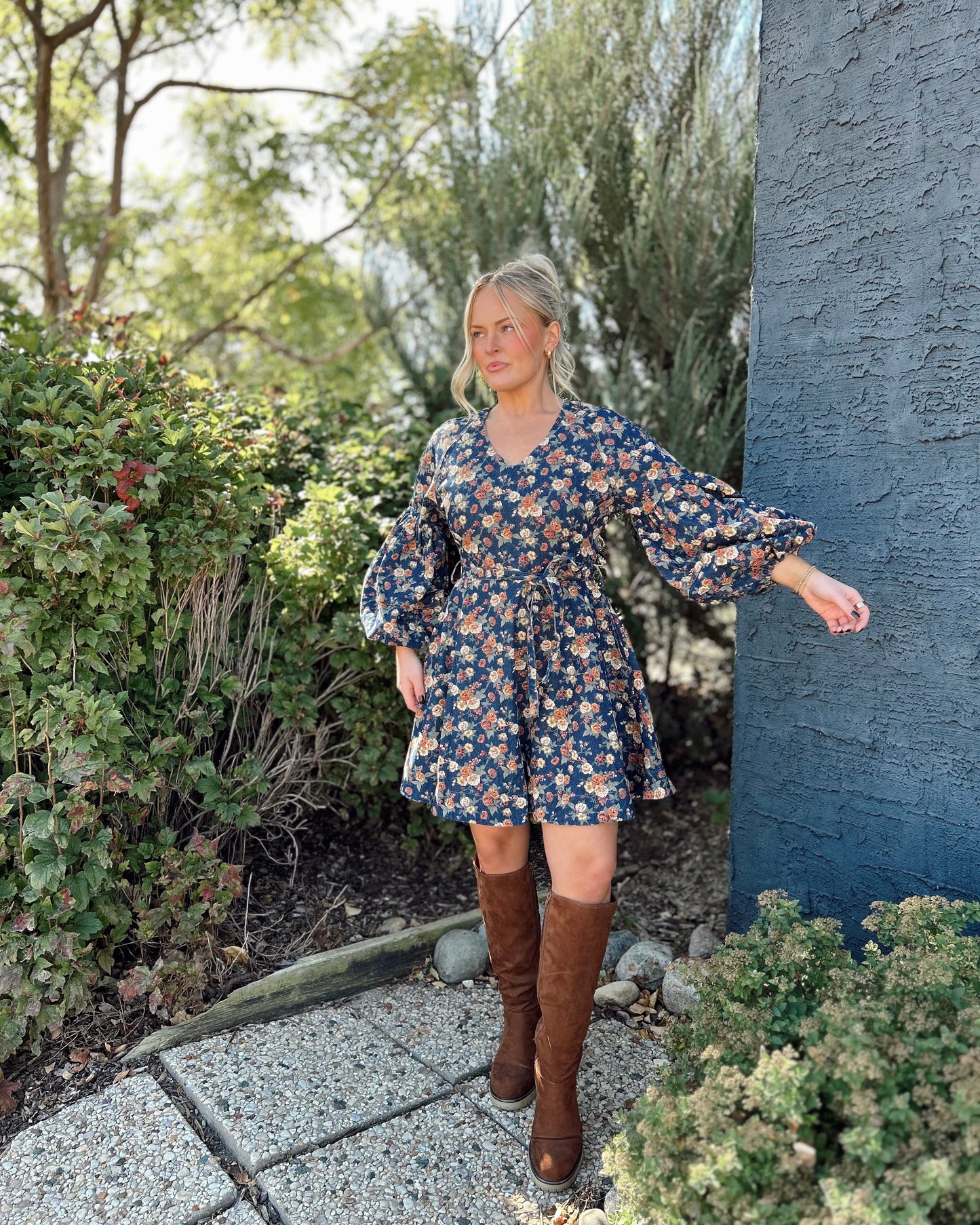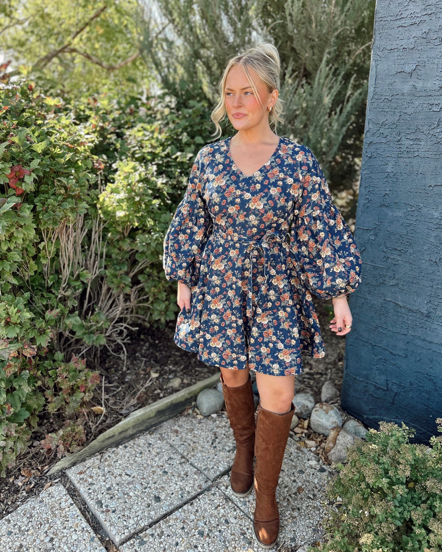 DETAILS: This playful denim dress features a lively floral print, charming balloon sleeves, and a flattering V-neckline. Its mini length hits at the thigh, accented by a waist-tie for a fun, flirty fit.