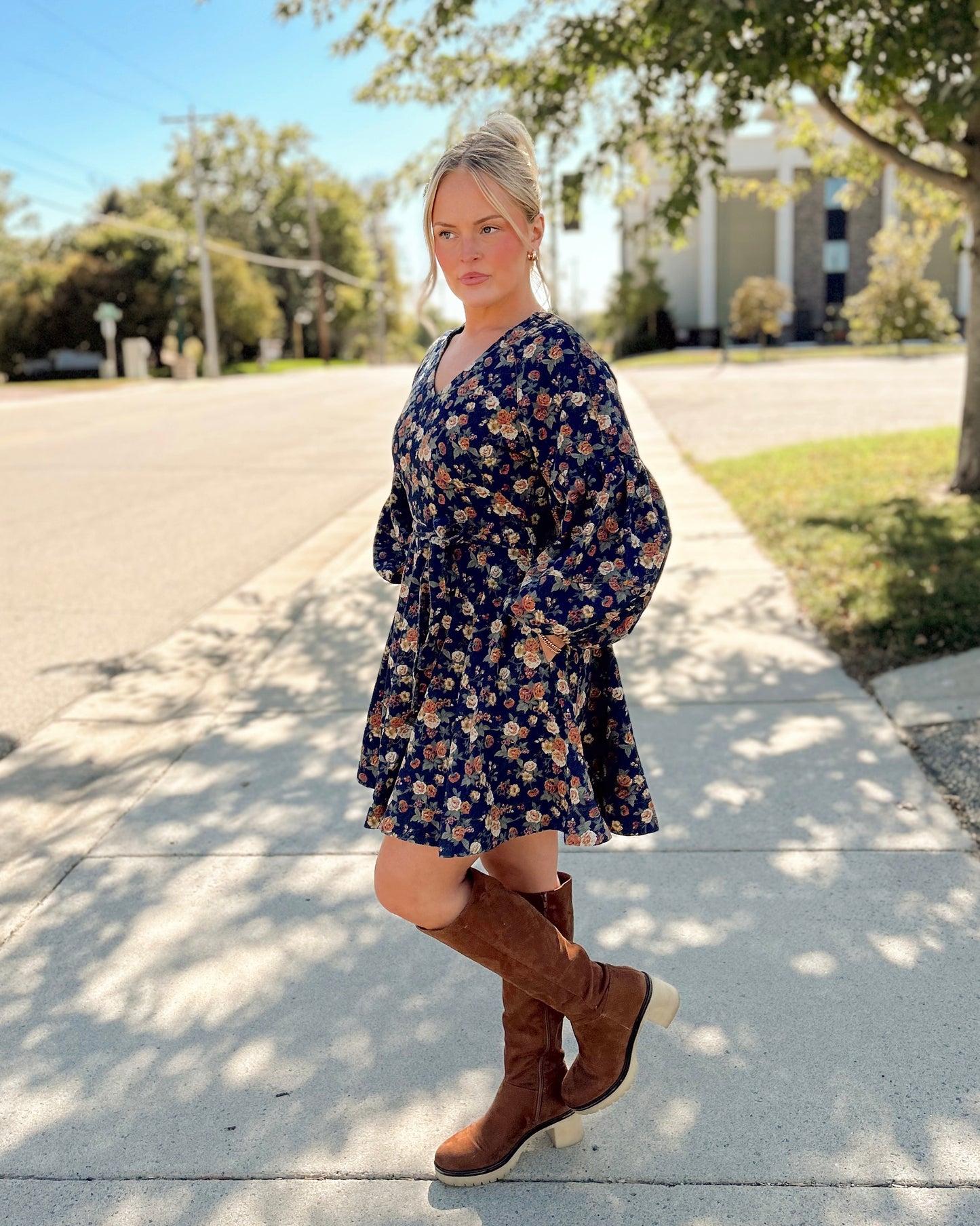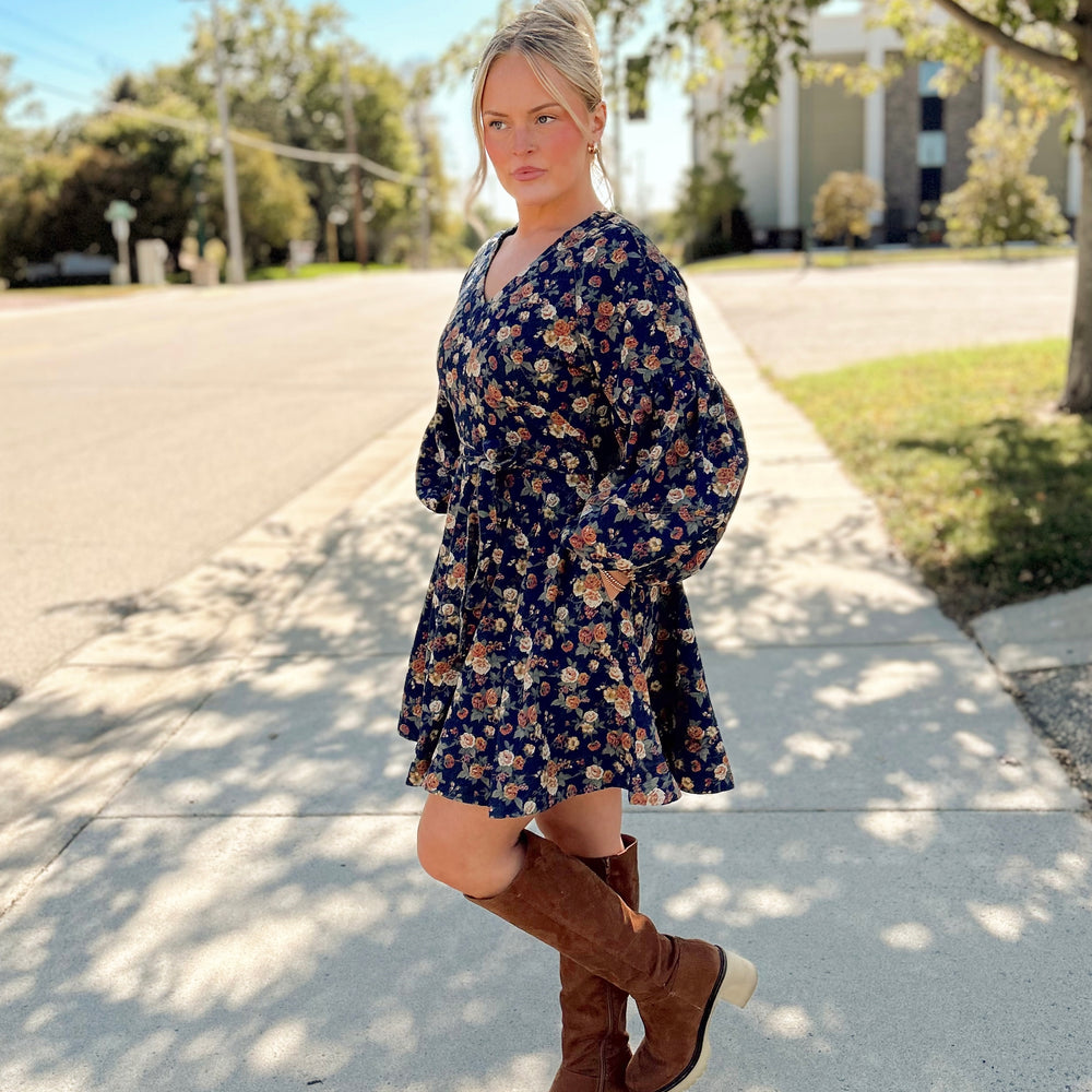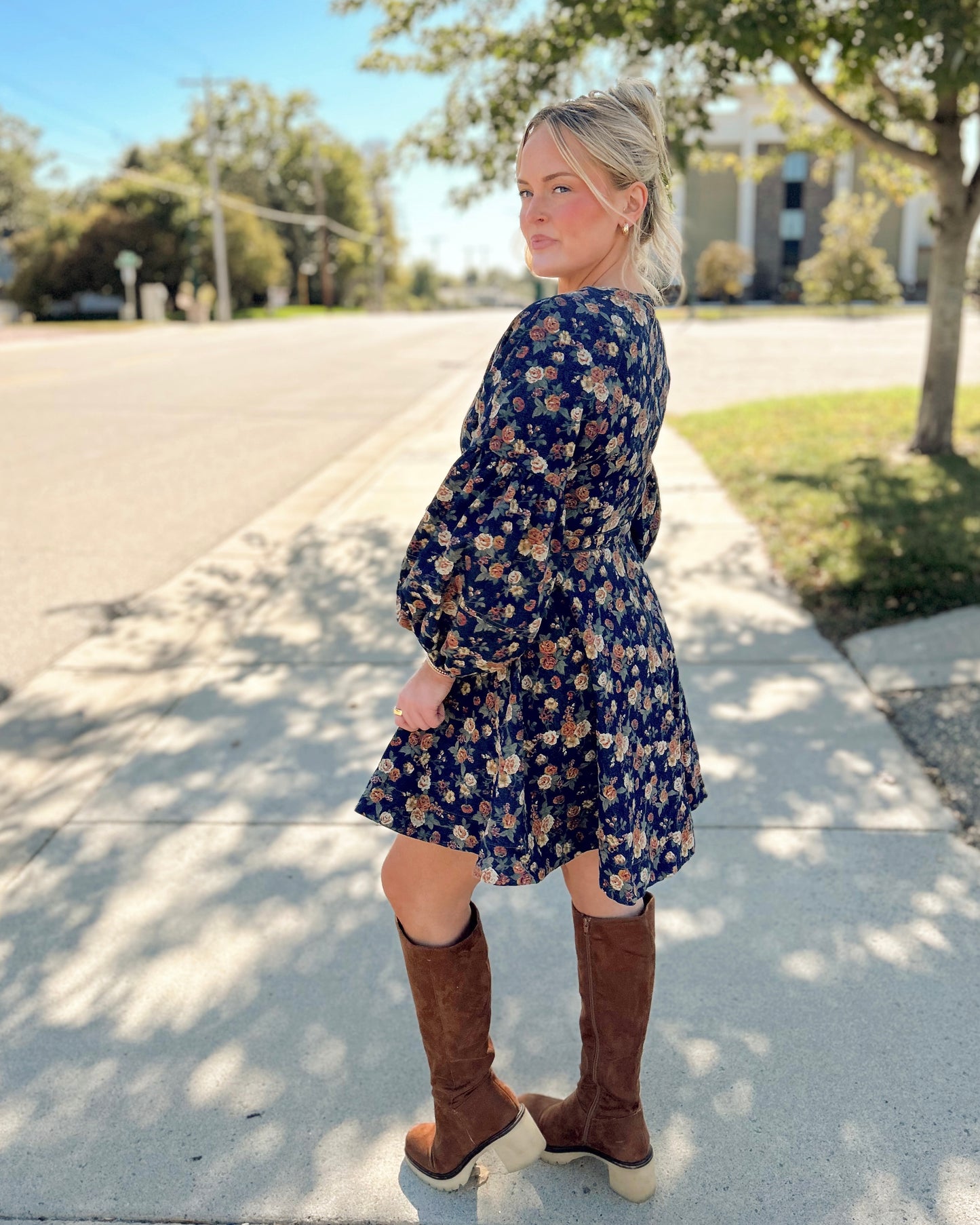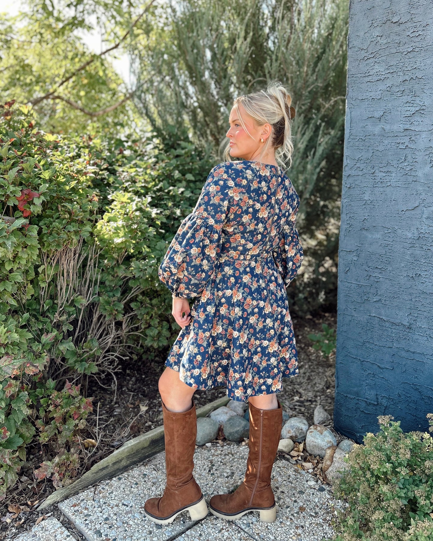 DETAILS: This playful denim dress features a lively floral print, charming balloon sleeves, and a flattering V-neckline. Its mini length hits at the thigh, accented by a waist-tie for a fun, flirty fit.
