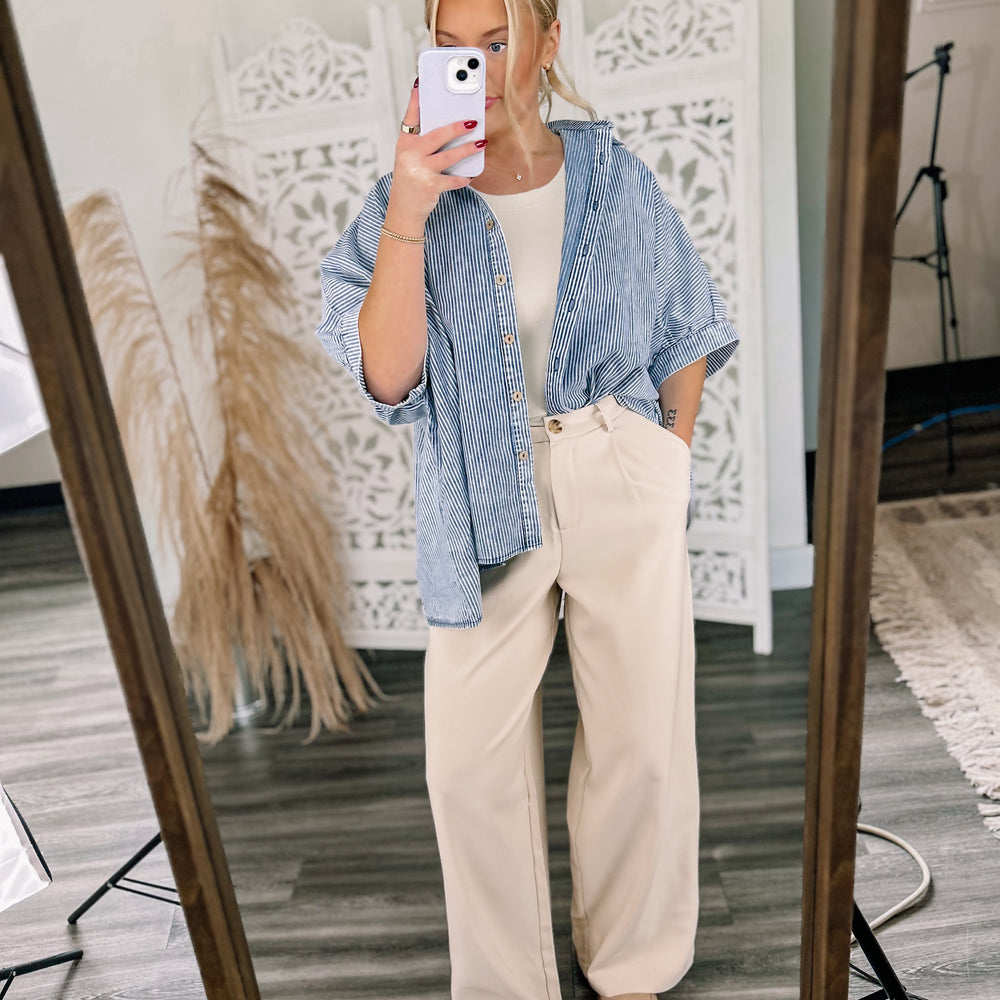 DETAILS: These taupe wide-leg trousers strike a fun balance between sleek tailoring and all-day comfort.